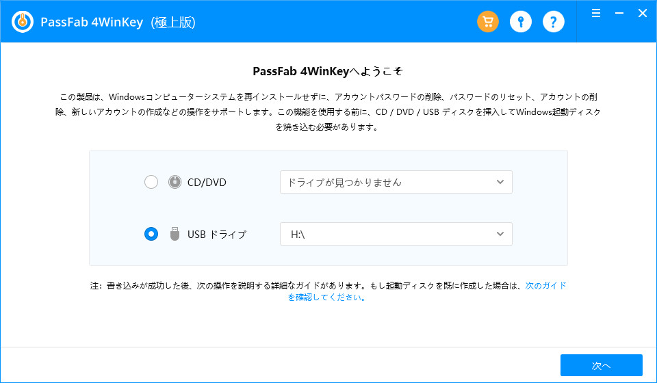 Step3:起動メディア(CD/DVDまたはUSB)を選択後、「次へ」をクリックして書き込みを始めます。起動メディアとして利用するCD/DVDまたはUSBに保存されているデータは書き込みと同時に消去されますので、事前に必要なデータはバックアップしておきます。