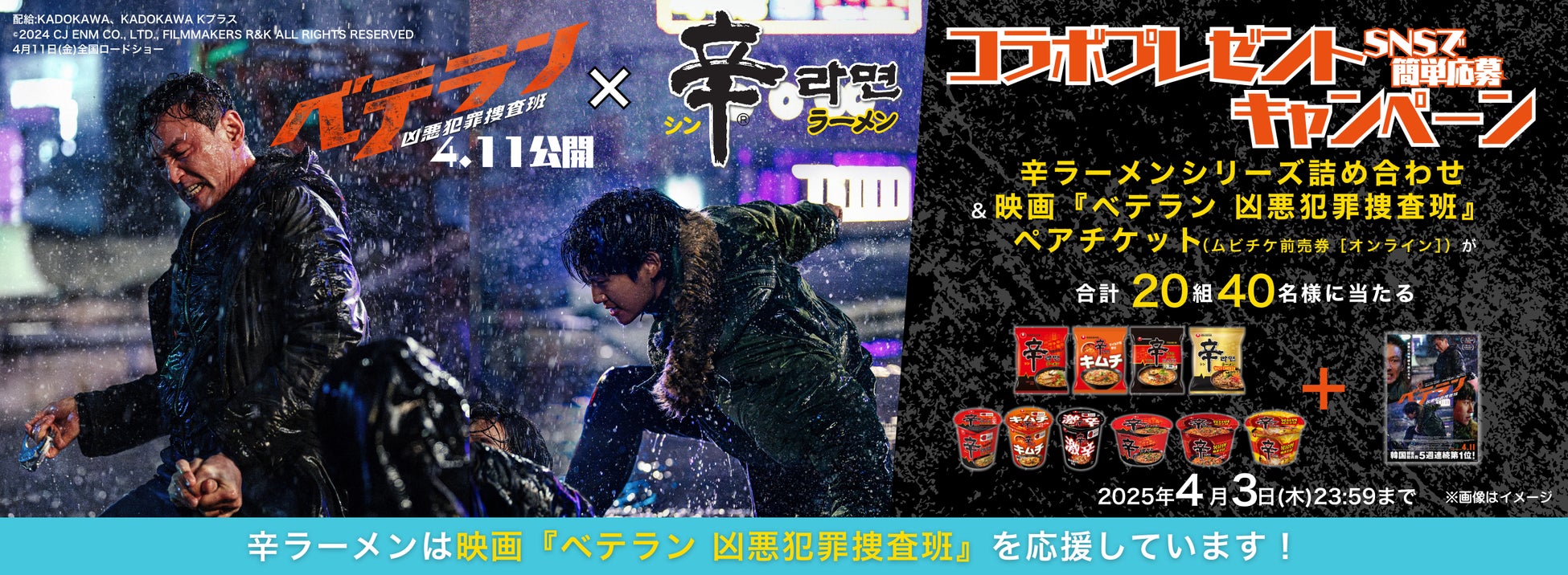株式会社農心ジャパン(本社:東京都千代田区、代表取締役社長:金大廈)は、映画「ベテラン 凶悪犯罪捜査班」が2025年4月11日(金)に公開されることを記念し、辛ラーメンとコラボレーションしたSNSキャンペーンを3月28日(金)~4月3日(木)に開催します。同作品は、韓国で観客動員数5週連続第1位、750万人が熱狂したメガヒットのクライムアクション映画です。劇中に主演のファン・ジョンミンが辛ラーメンを食べるシーンが登場することから、今回コラボキャンペーンを実施することとなりました。当キャンペーンでは、辛ラーメン公式Instagram・Xでご応募いただいた方から抽選で合計20組40名様に映画ペアチケットと辛ラーメンシリーズ製品詰め合わせが当たります。