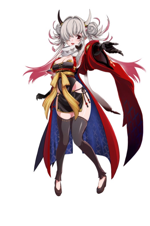 身⾧152㎝、7月21日生まれの『⿁』をモチーフにした キャラクター。白髪に赤の毛先、白黒の色違いの角が特 徴的で、片目で笑うかわいらしい顔をしており、衣装は 黒と赤を基調とした、金の差し色が映えるシックな色彩 のキャラクターデザイン。