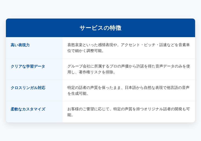これにより、お客様は著作権侵害のリスクを心配することなく、安心して「NEXPEEECH®」が生成した音声を自社のサービスや製品に組み込むことができます。企業のコンプライアンスを遵守し、ブランドイメージを守る上で、学習データの透明性は何よりも重要であるとORENDA WORLDは考えます。