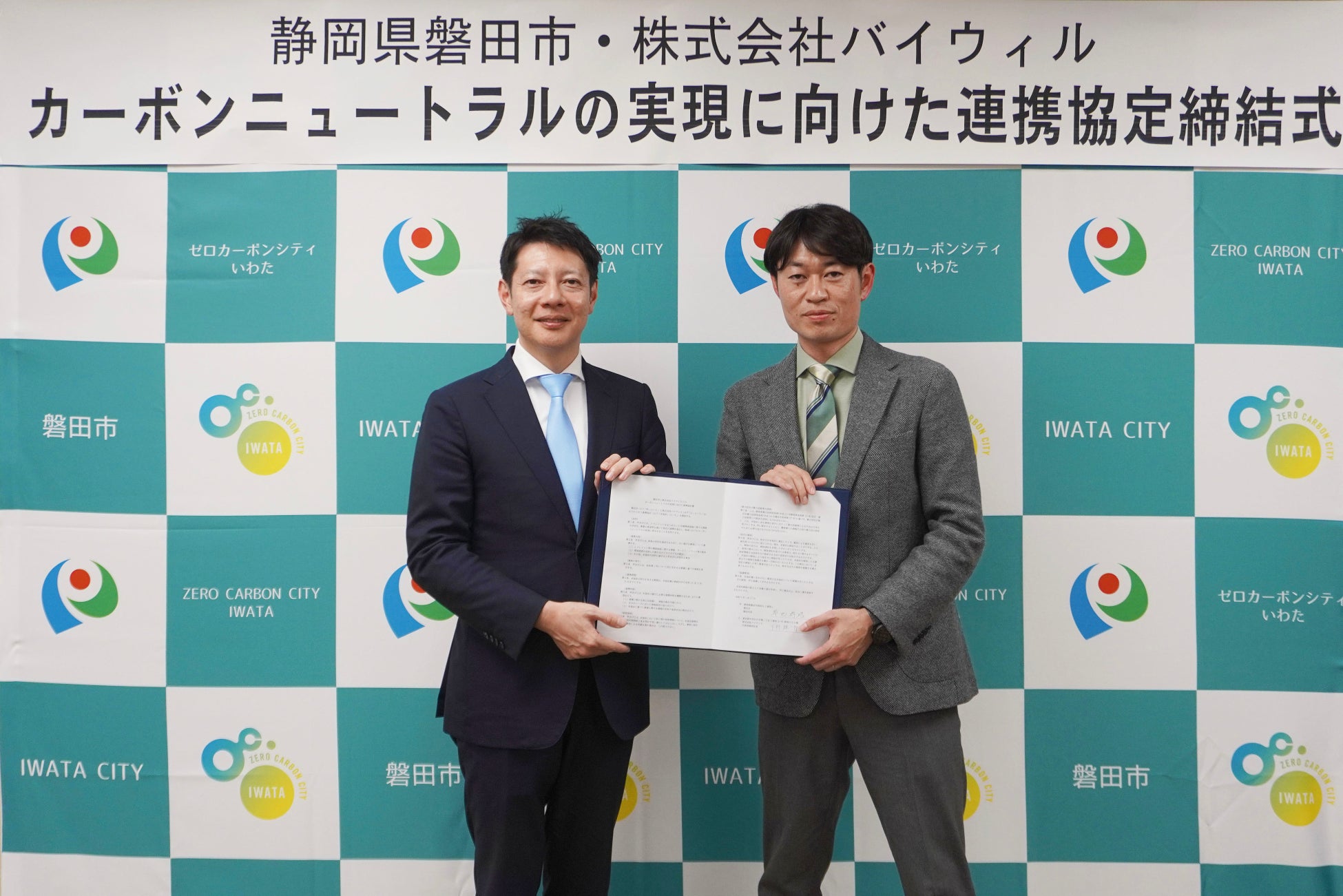 静岡県磐田市は、2050年までに地球温暖化の原因となる二酸化炭素排出量の実質ゼロを目指す「ゼロカーボンシティ」を表明しています。市・市民・事業者の共創により新たに環境価値を創出し、地域におけるカーボンニュートラルの実現に寄与するため、1月17日(金曜)に株式会社バイウィルと「カーボンニュートラルの実現に向けた連携協定」を締結しました。