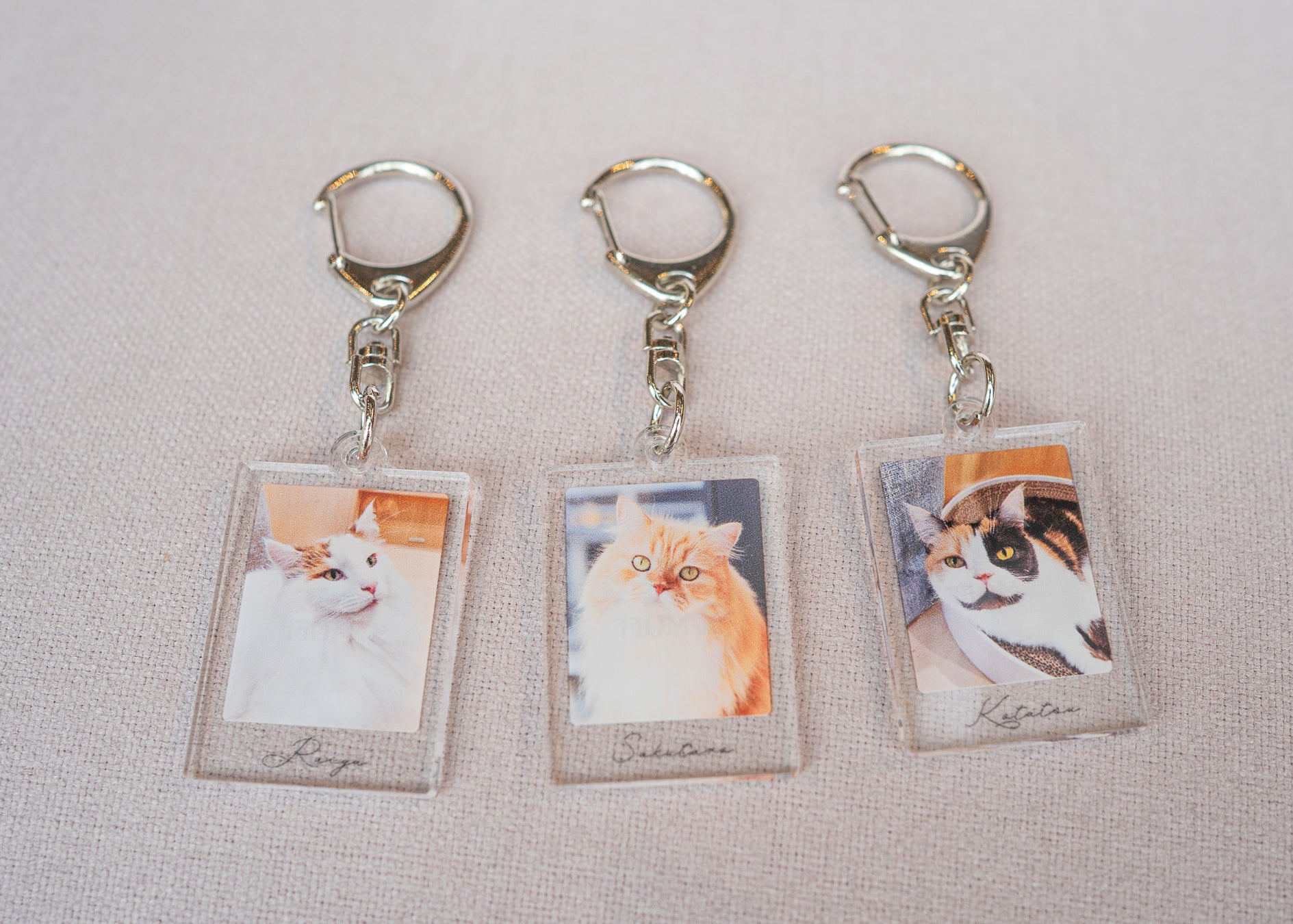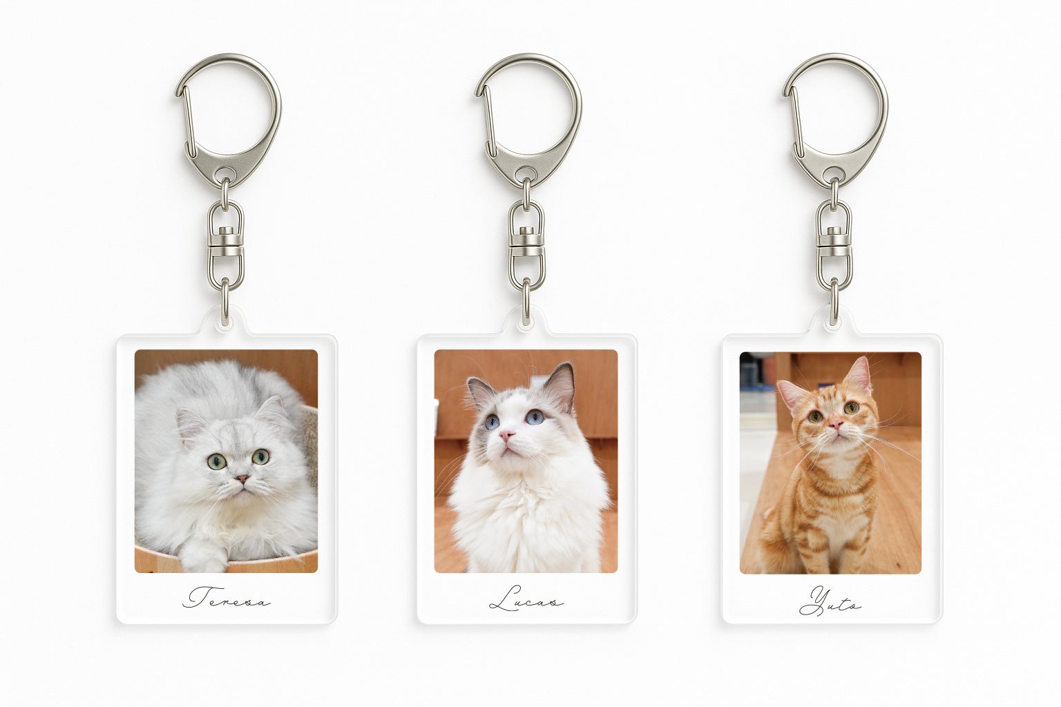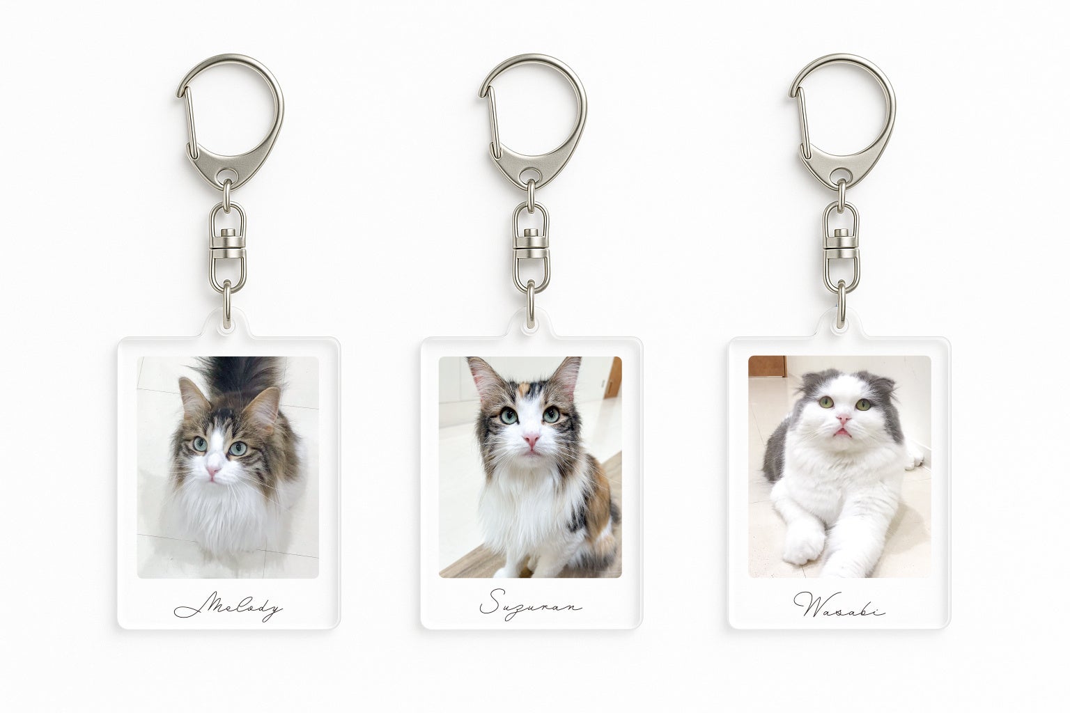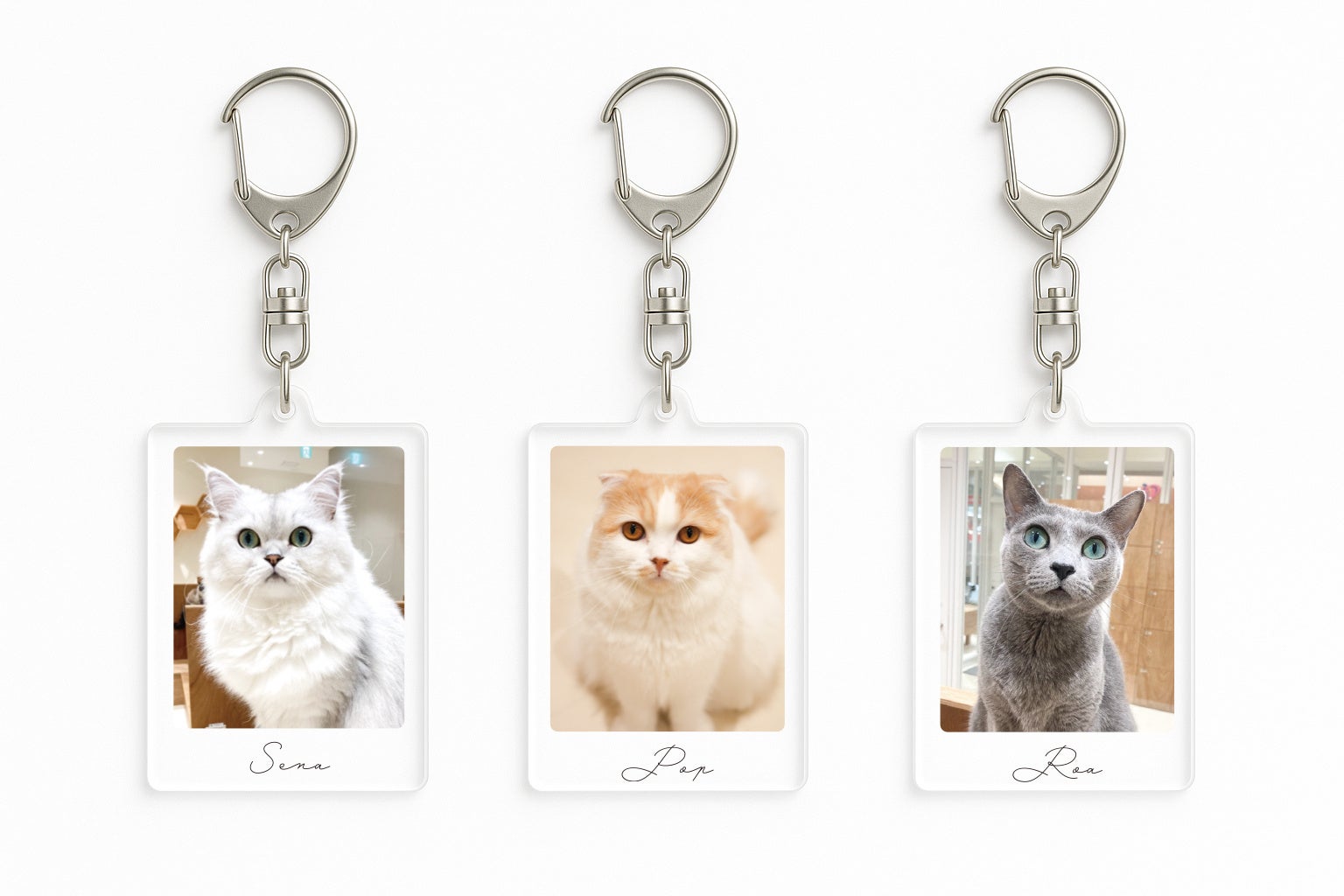 各店舗の1位〜3位ネコがチェキ風デザインのアクリルキーホルダーに!チェキのときめきとキーホルダーの手軽さを融合した、”推しを持ち歩く”ためのスペシャルアイテムです。店舗ごとに異なるネコのデザインを楽しめるので、訪れるお店によってラインナップもさまざま。