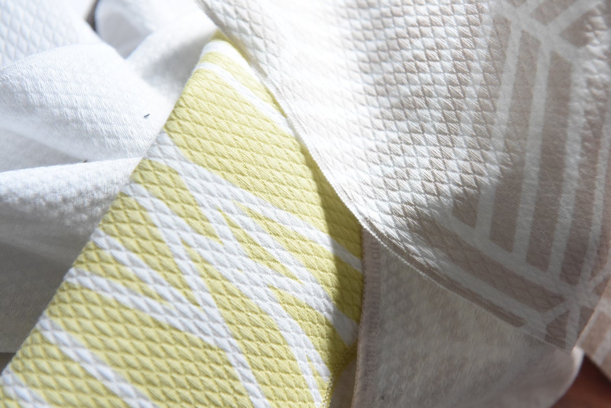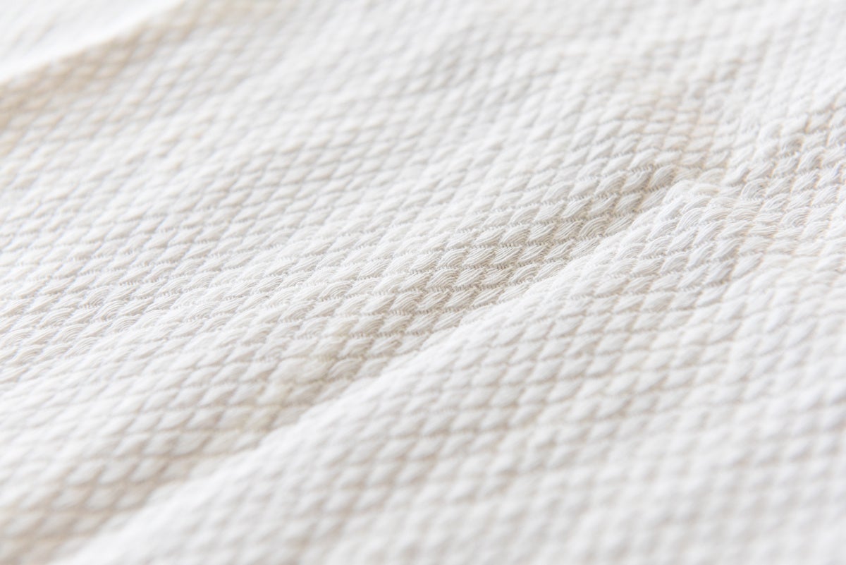 小さなダイヤ柄が規則正しく並んだ織地は、水分が1点に集中しないで横へ広がることで、早く乾いてくれるのもポイント。