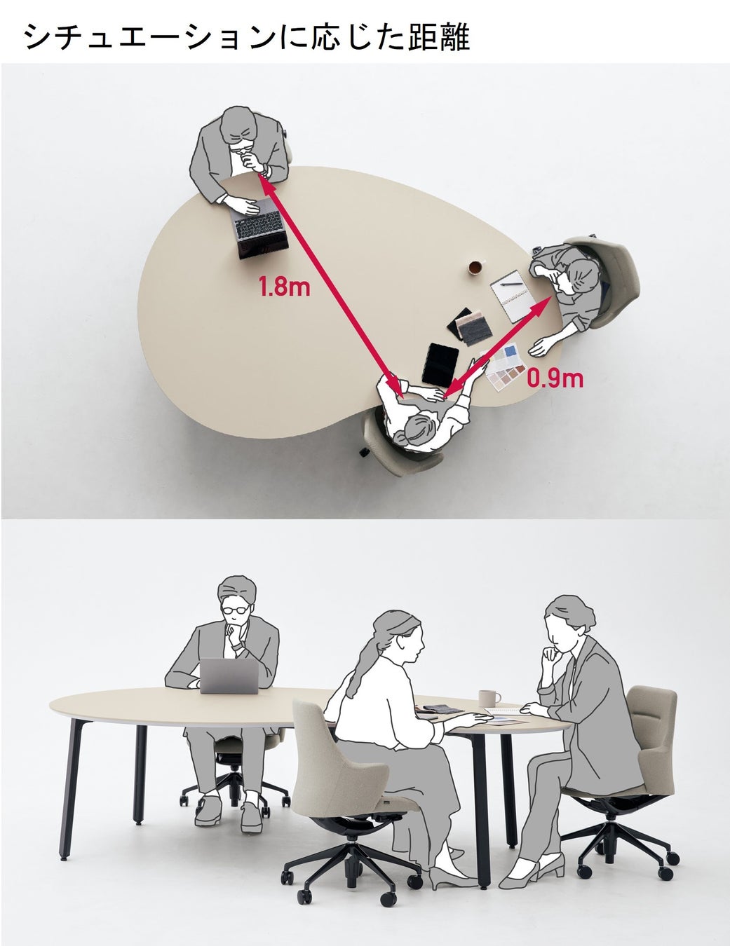 オカムラでは、アメリカの文化人類学者であるエドワード・ホールが提唱したパーソナルスペースの考え方を参考に、人を中心に半径1.2mの間隔が個人作業を快適に行うために必要な領域と定義しており、この条件を満たした座席をワークポイントと呼んでいます※1。また、相手との関係性や作業の内容に応じて隣の人や対面の人との距離を変えることも、快適性に有効です。親密な相手であれば距離を狭め、関係性の薄い相手とは距離を広げるといった調節を自律的に行うことで、快適性とコミュニケーションの両立を図ることができます。