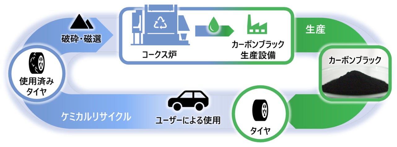 タイヤ業界でサステナブルな原材料を求める動きが加速しているなか、主原料のひとつであり、ゴムの補強剤として使用されているカーボンブラックについても再生原料化のニーズが高まっています。当社グループのサプライチェーンを活用することで、破砕した使用済みタイヤを原料としてコークス炉に投入し、得られたタールから再びカーボンブラックを生産することができます。コークス炉を活用し、使用済みタイヤから再生産した資源循環型カーボンブラックを販売することは世界初※2の試みです。生産した資源循環型カーボンブラックは通常品と同等の性能を有し、再びタイヤ用のカーボンブラックとして使用されることでタイヤの水平リサイクル実現に貢献します。
