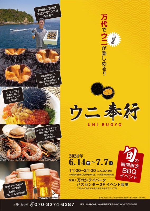 新潟市で !三陸産▶▷殻付きウニ◁◀を炭火焼き!6/14-7/7の限定出店!激レア旬のウニを炭火で楽しむ『ウニ奉行 万代シテイパーク店』