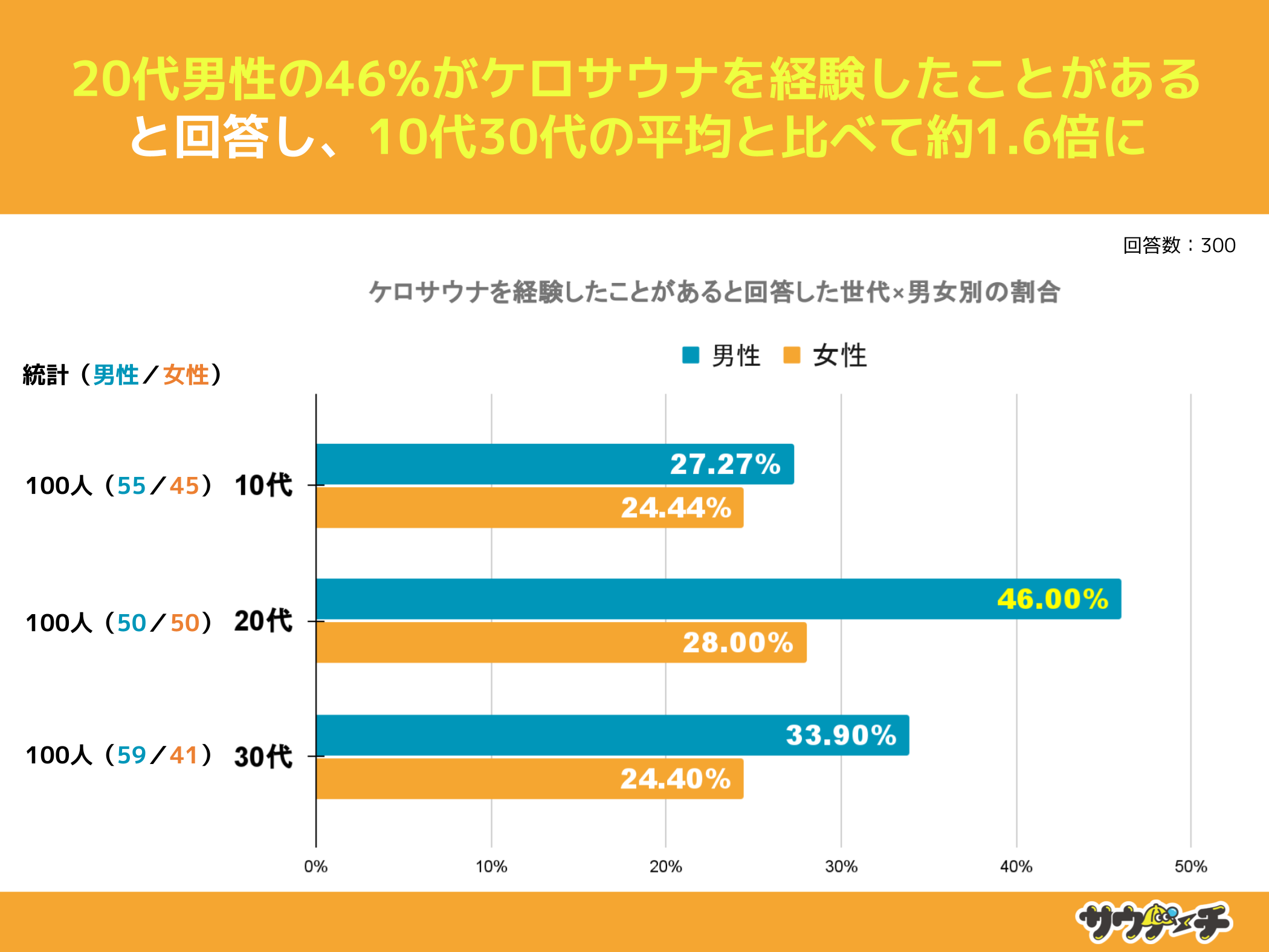 【20代男性の46%がケロサウナを経験したことがあると回答し、10代30代の平均と比べて約1.6倍に】