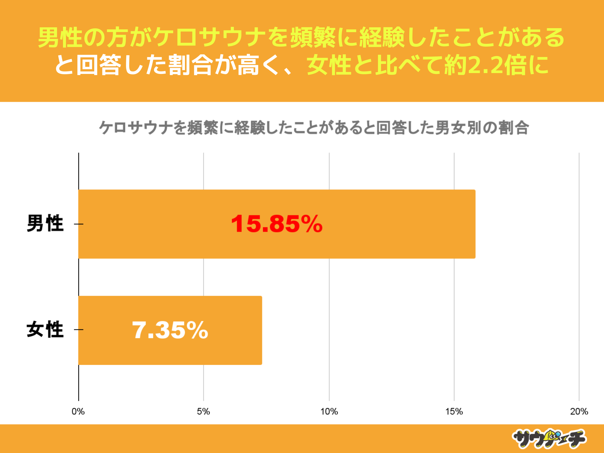 ケロサウナを頻繁に経験したことがあると回答した割合を男女別でみてみますと、男性が約16%、女性が約7%で、女性と比べて男性は約2.2倍高い結果となりました。