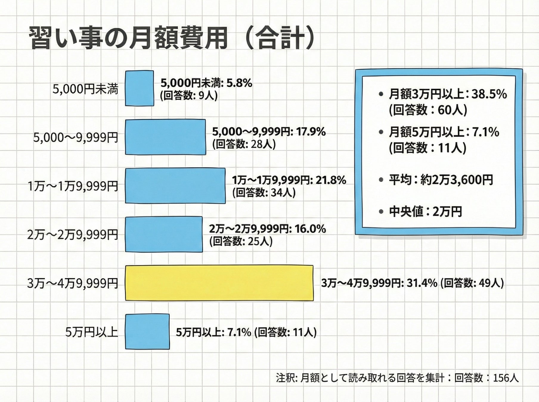 習い事費用の月額(合計)の自由記述を集計したところ、月額として読み取れる回答は156人分でした。