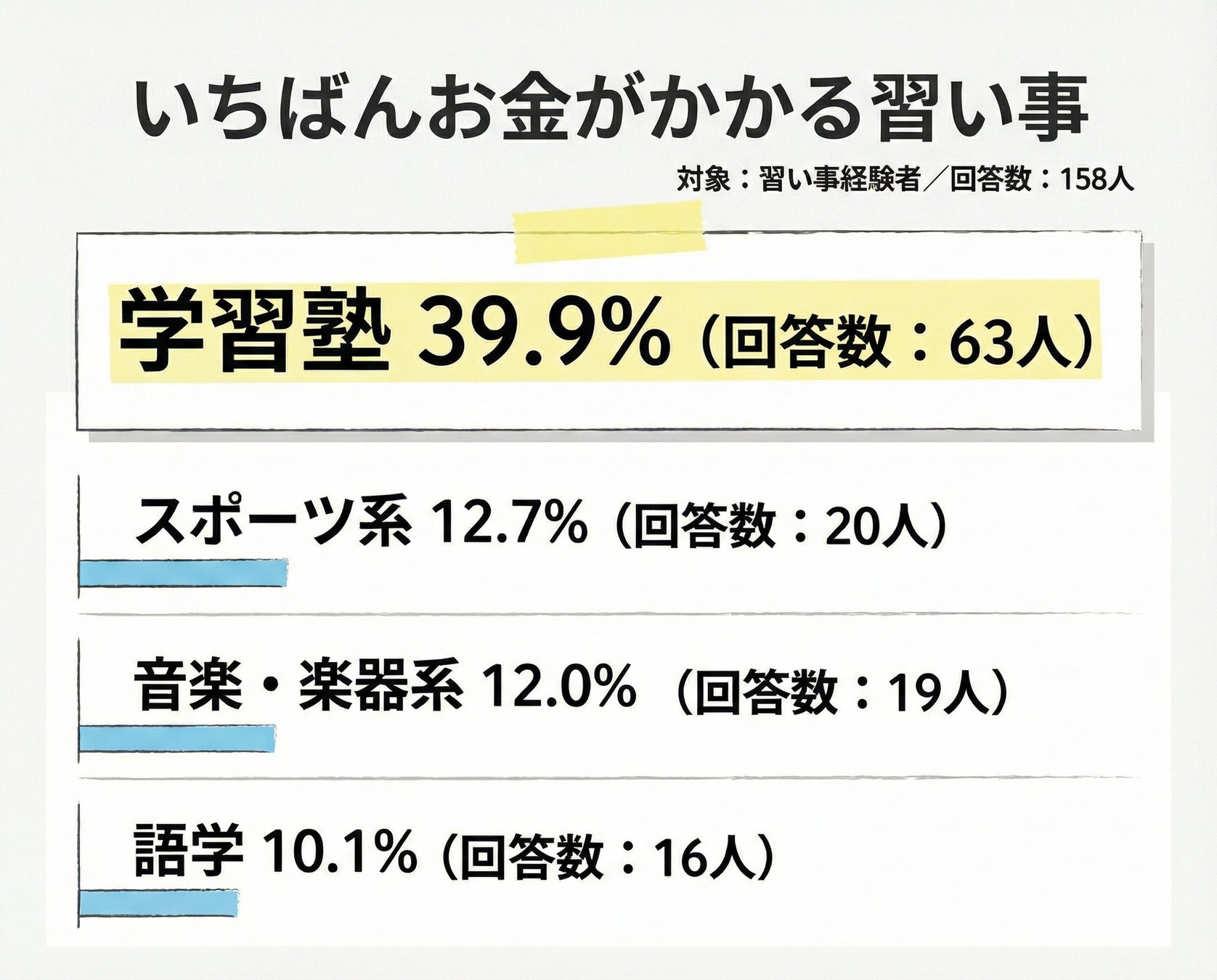 ・いちばんお金がかかる習い事は学習塾が39.9%(63人)で最多