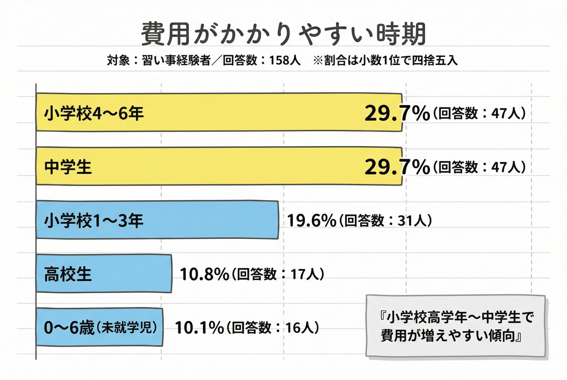 【結果2】費用がかかりやすいのは小学校4〜6年29.7%(47人)、中学生29.7%(47人)