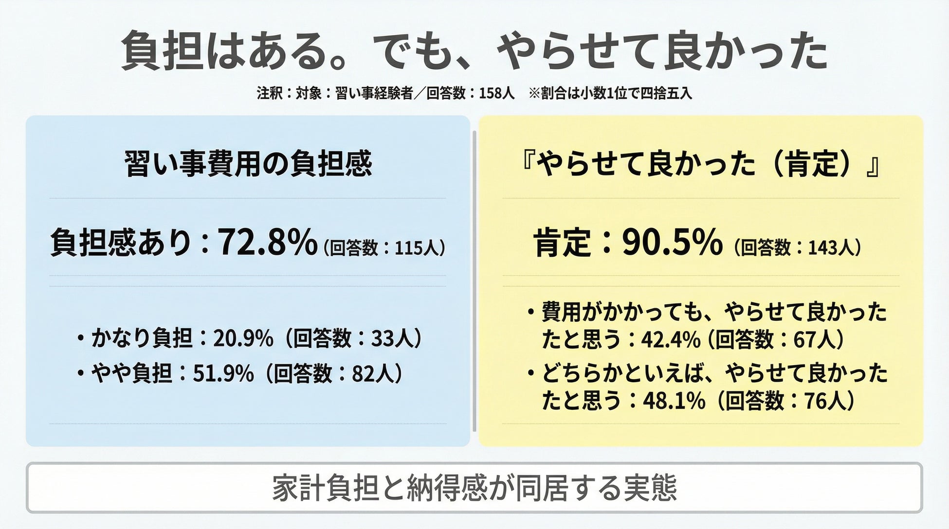 一方で、やらせたことへの評価は良かったが90.5%(143人)と高く、家計負担と満足感が同居する実態が見えてきました。