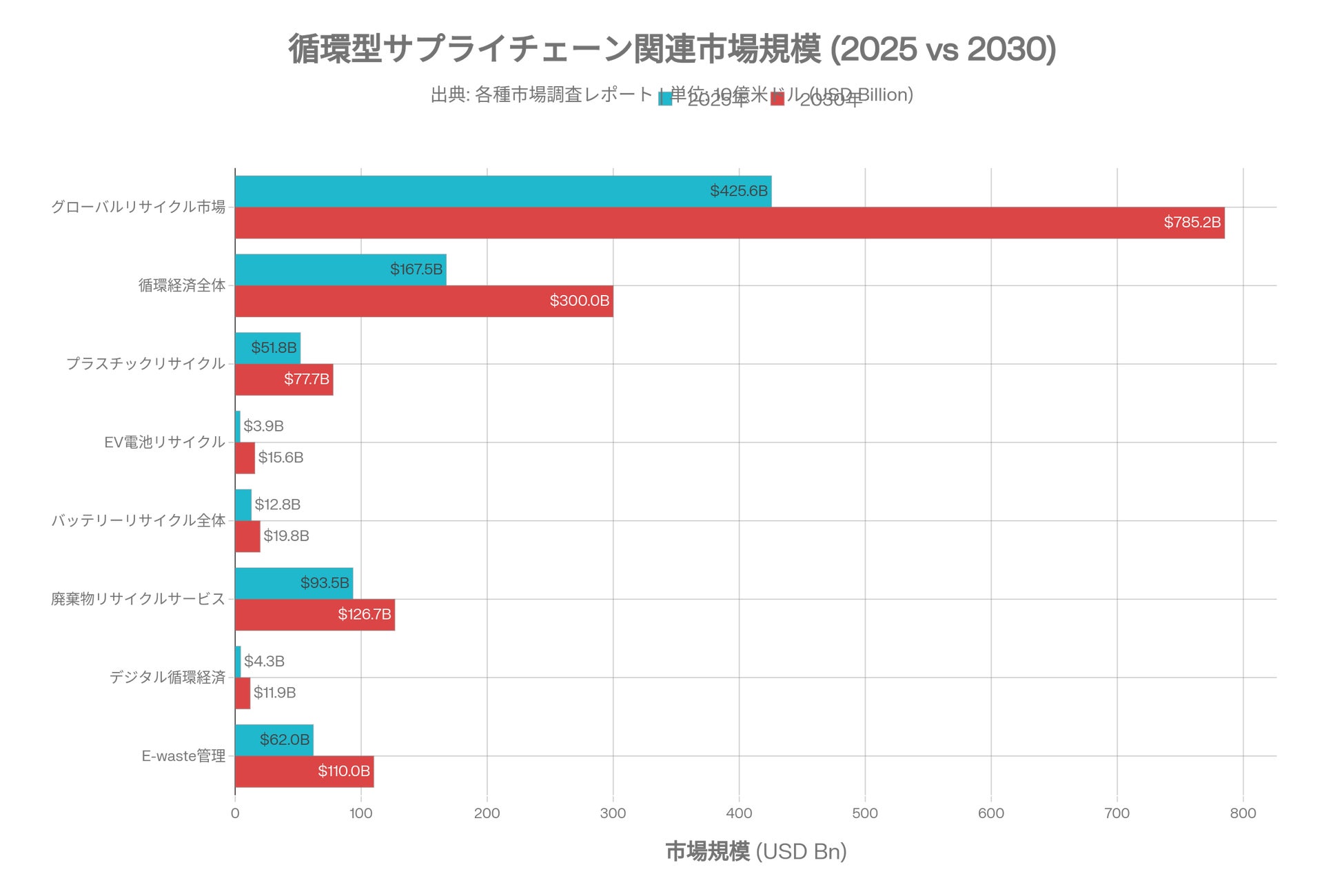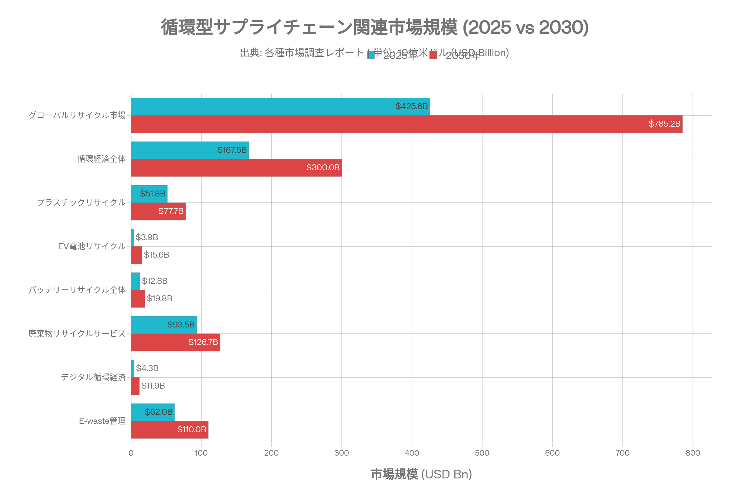 グローバルリサイクル市場は2025年の約4,256億ドルから2033年には7,852億ドルへ拡大し、CAGR 8%で成長する見通しである。循環経済全体では2025年の1,675億ドルから2034年に4,433億ドル(CAGR 11.4%)に達する見込みであり、もはや「ニッチ」ではなく産業の主軸として位置づけられる。
