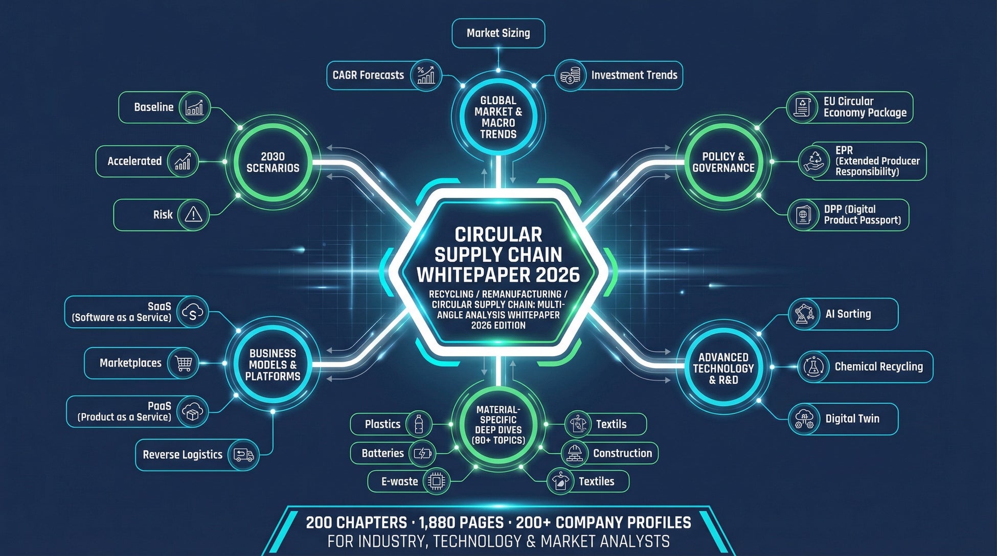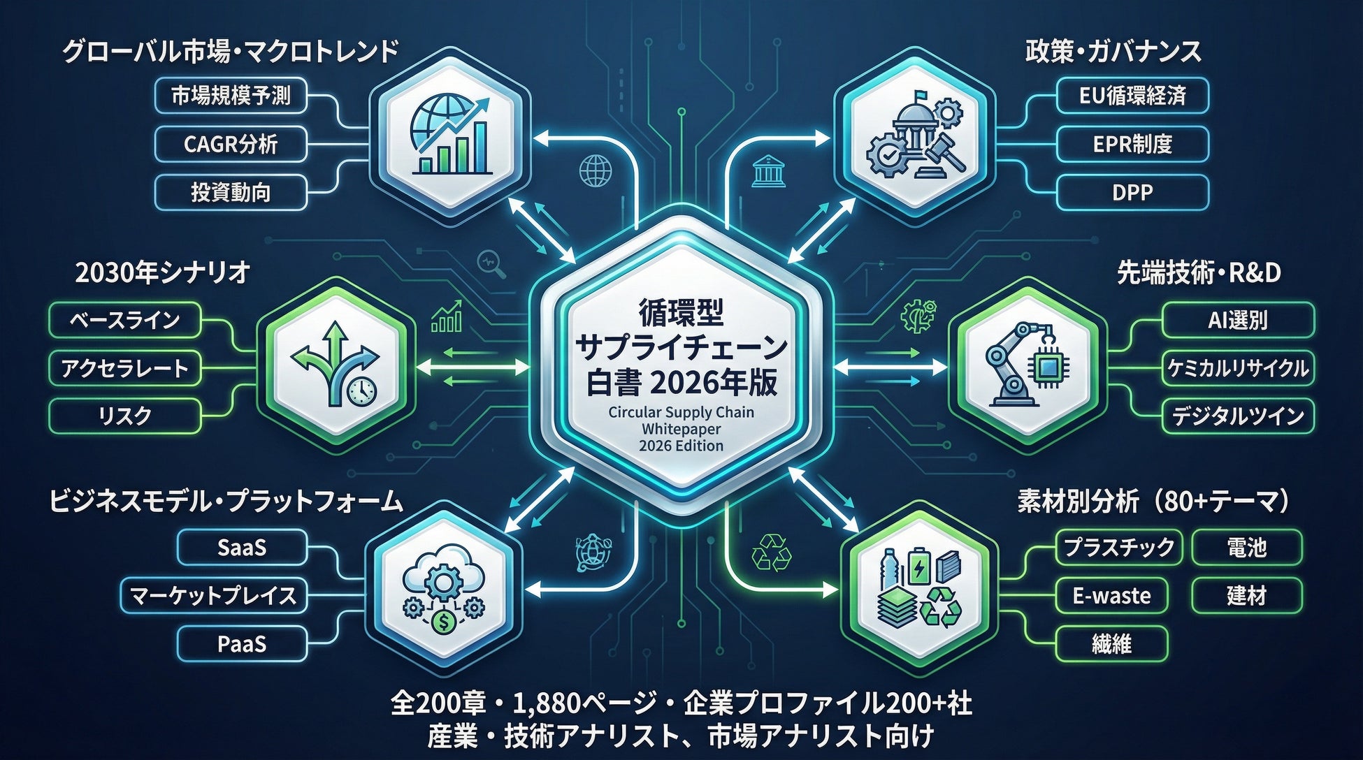プラスチック、PET、CFRP、CNF/CNT、LIB、PCB、e-waste、TiO₂、バイオガス、再生炭素繊維、3Dプリント用リサイクル樹脂、自己修復型ポリマーなど、80を超える素材・プロセステーマについて構造原理→産業モデル→市場規模→2030年シナリオを統一フレームで分析している。