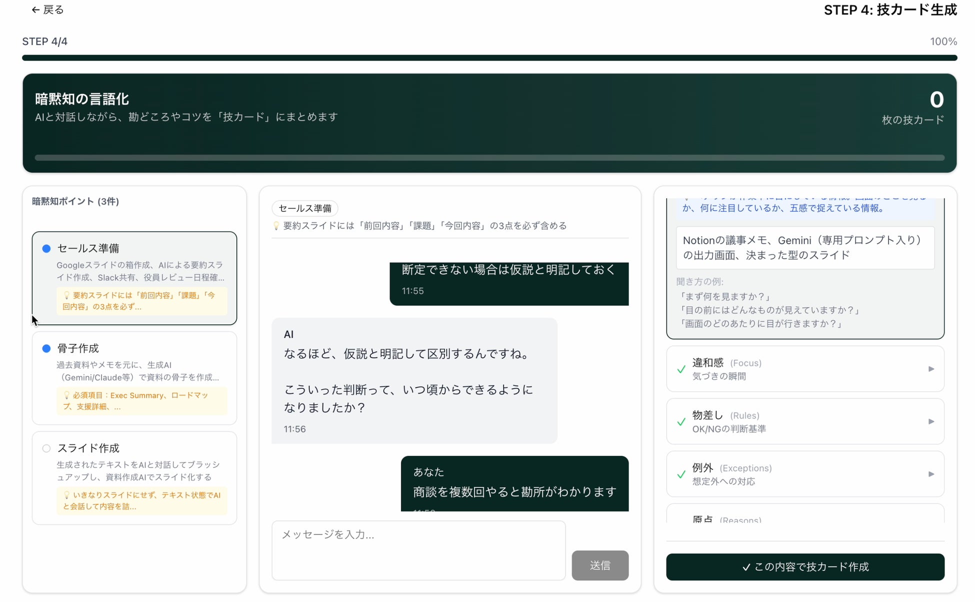 AIが深掘りして技カード化:「5つの問い」で暗黙知を言語化