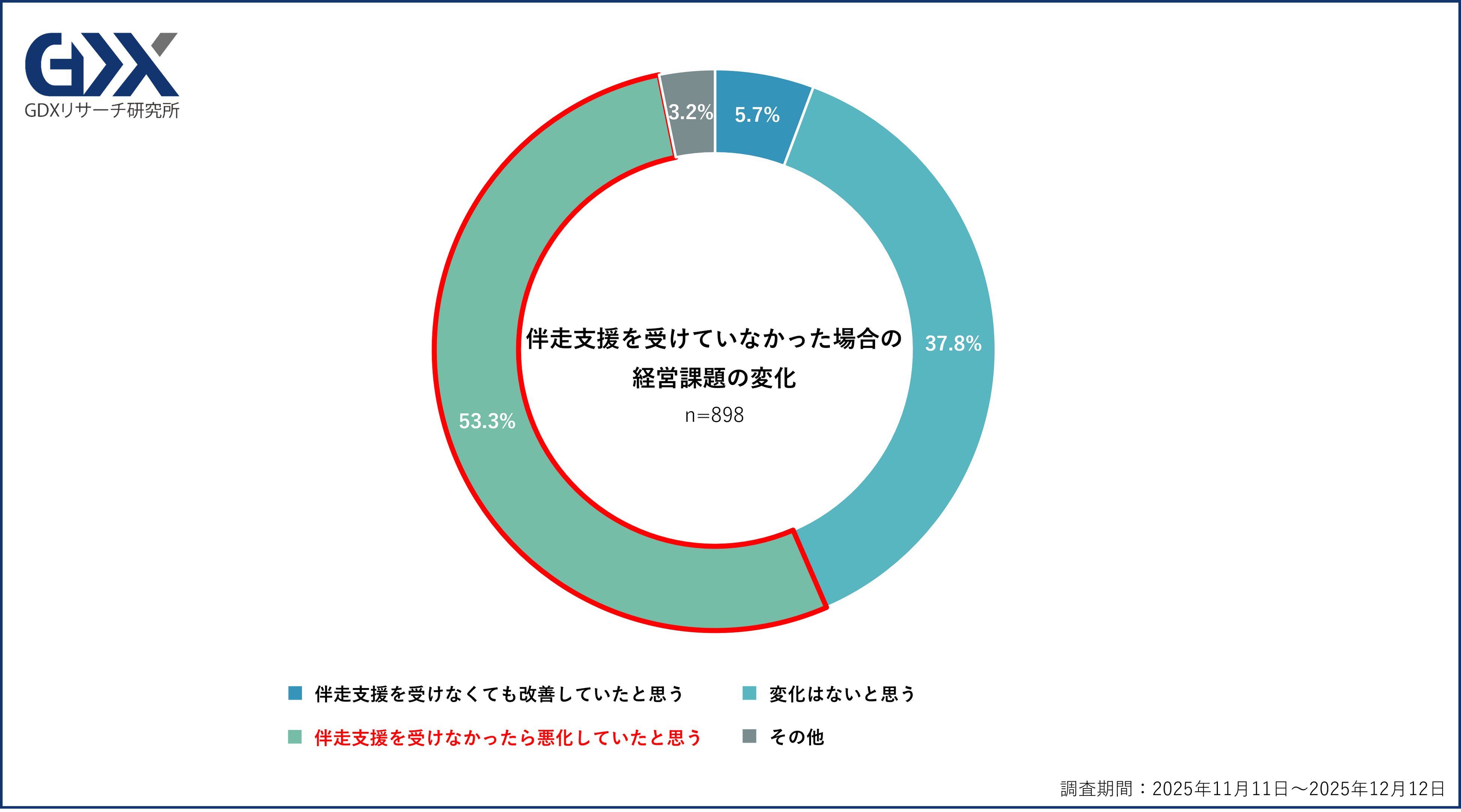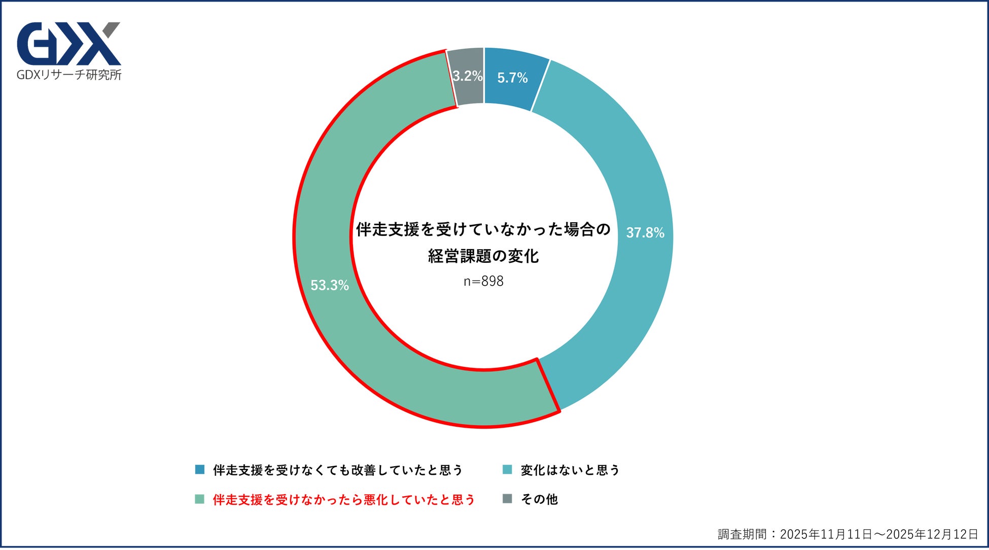 一方で、「変化はないと思う」(37.8%)と「伴走支援を受けなくても改善していたと思う」(5.7%)を合わせると43.5%に及び、“一定の効果を実感する層”と“効果を実感しにくい層”が併存している状況も示されました。