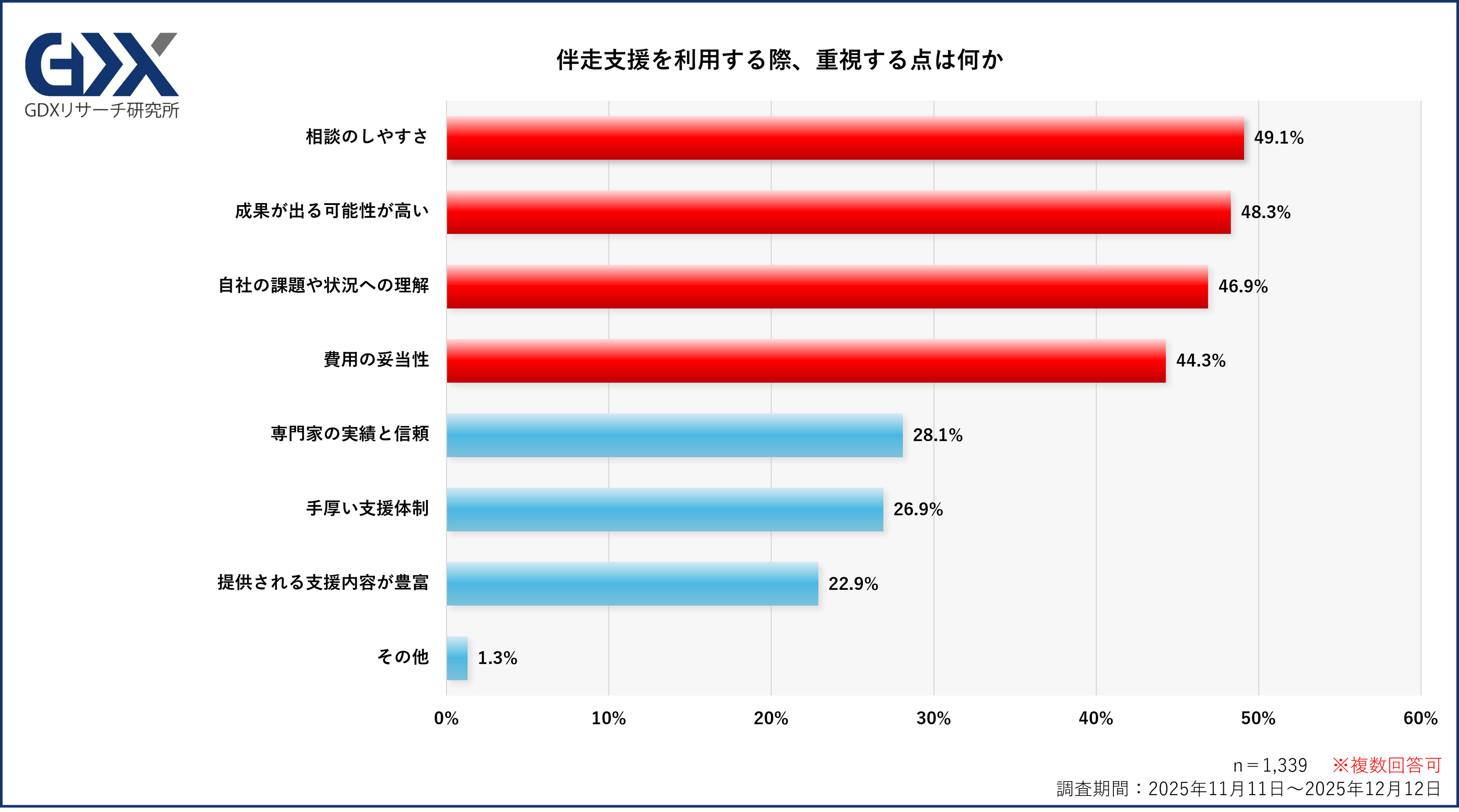 Q3で「利用するつもりはない」を選択した企業は除外し、伴走支援を利用する際に重視する点は何かという設問では、最も多かったのは「相談のしやすさ」(49.1%)で約半数に及びました。
