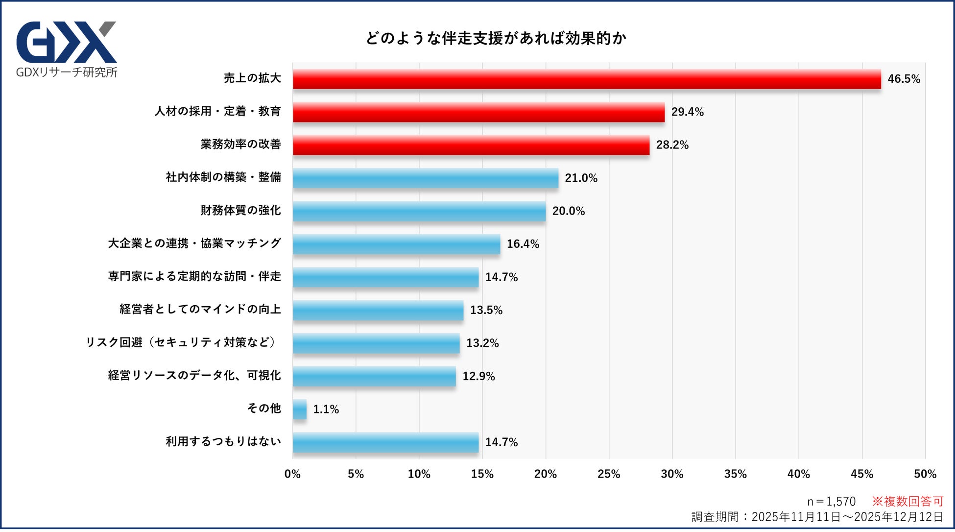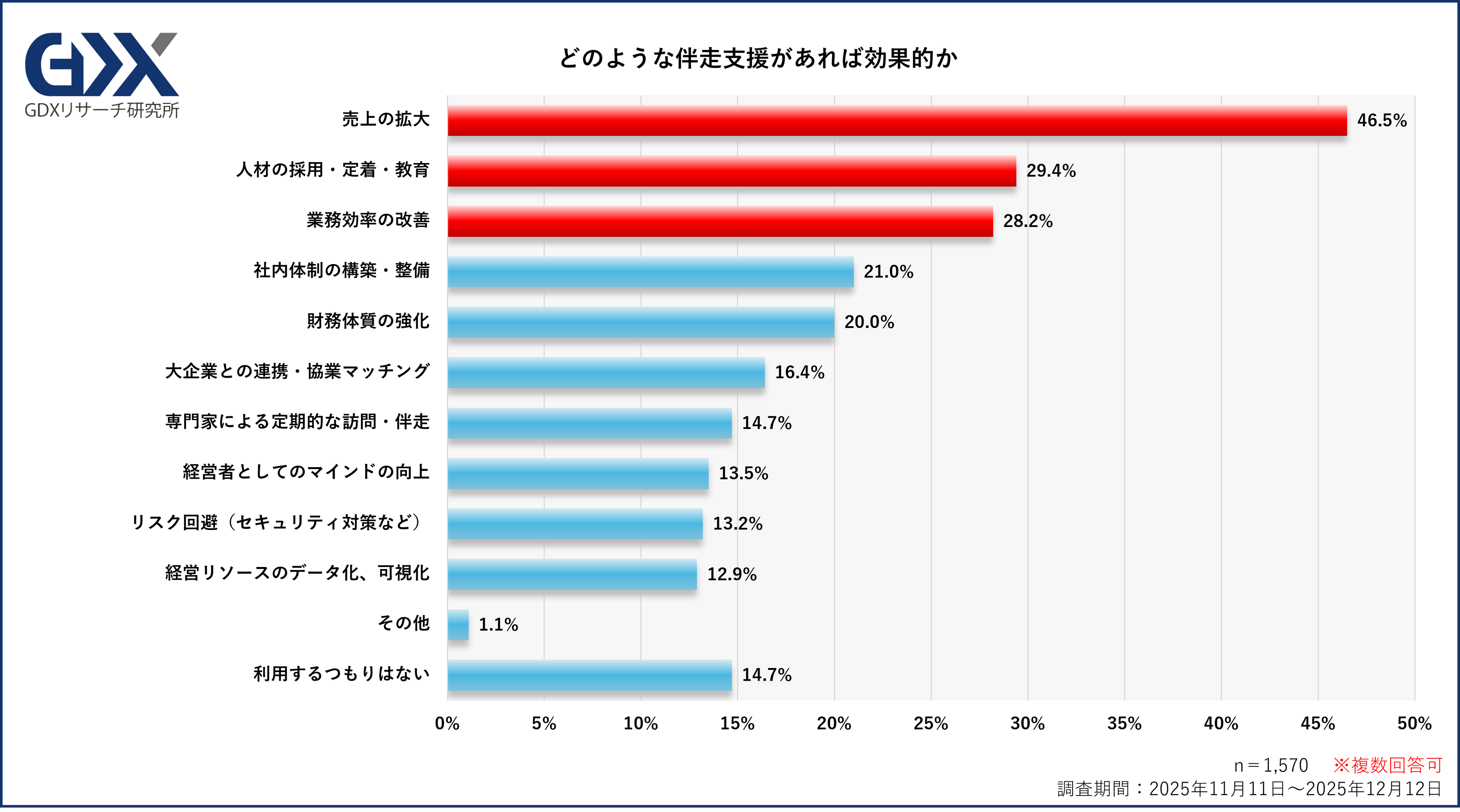 また、伴走支援の経験有無を問わず、経営課題を解決するために「どのような伴走支援があれば効果的だと思うか」を問う設問では、最多は「売上の拡大」(46.5%)で突出しており、次いで「人材の採用・定着・教育」(29.4%)、「業務効率の改善」(28.2%)が続きました。