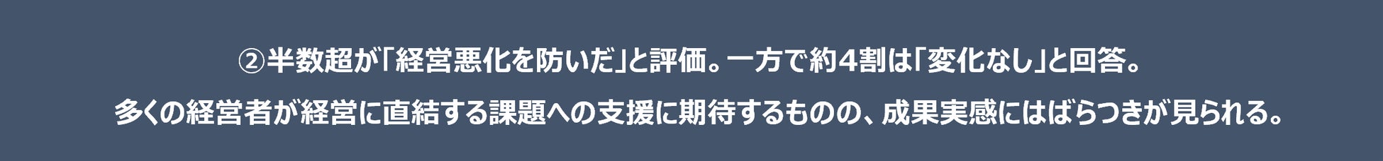 ②半数超が「経営悪化を防いだ」と評価。一方で約4割は「変化なし」と回答。