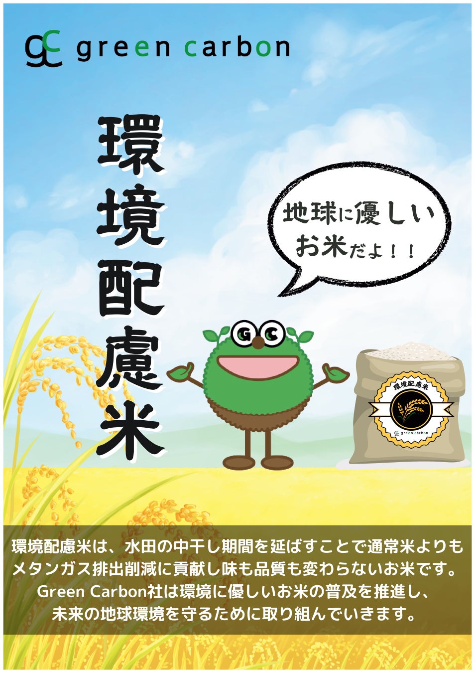 J-クレジット創出に際し、中干し延長した圃場で生産されたお米は、通常よりもメタンガス排出が抑制された、地球にやさしいお米「環境配慮米」としてGreen Carbonがブランド化しています。ブランド価値を高め、生産者の新たな販路拡大、収益向上を目指し普及に取り組んでいます。