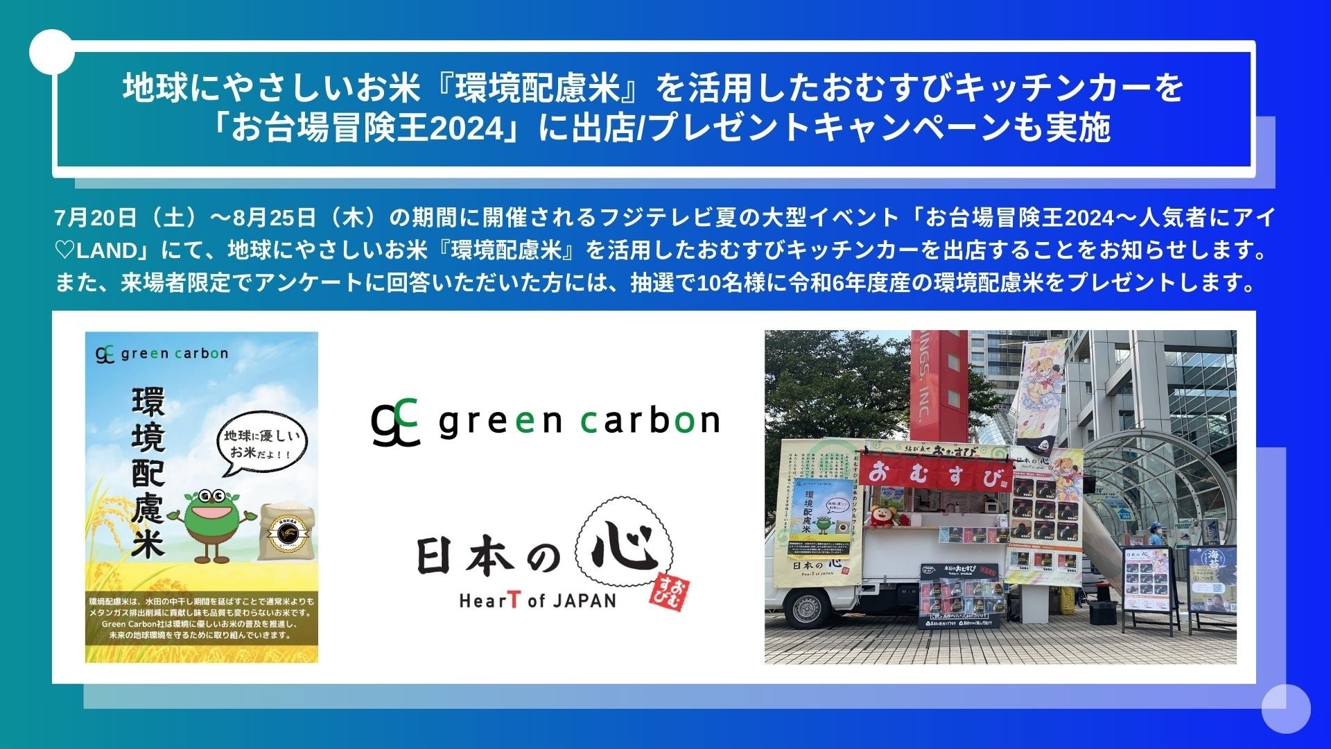 Green Carbon株式会社(代表取締役:大北潤、以下Green Carbon(読み;グリーンカーボン))はこの度、おむすびキッチンカー「日本の心」を運営する株式会社民虎(執行役員CEO:仁井田 大慈、以下民虎)と連携し、7月20日(土)~8月25日(木)の期間に開催されるフジテレビ夏の大型イベント「お台場冒険王2024~人気者にアイ♡LAND」にて、地球にやさしいお米『環境配慮米』を活用したおむすびキッチンカーを出店することをお知らせします。また、来場者限定でアンケートに回答いただいた方には、抽選で10名様に令和6年度産の環境配慮米をプレゼントします。