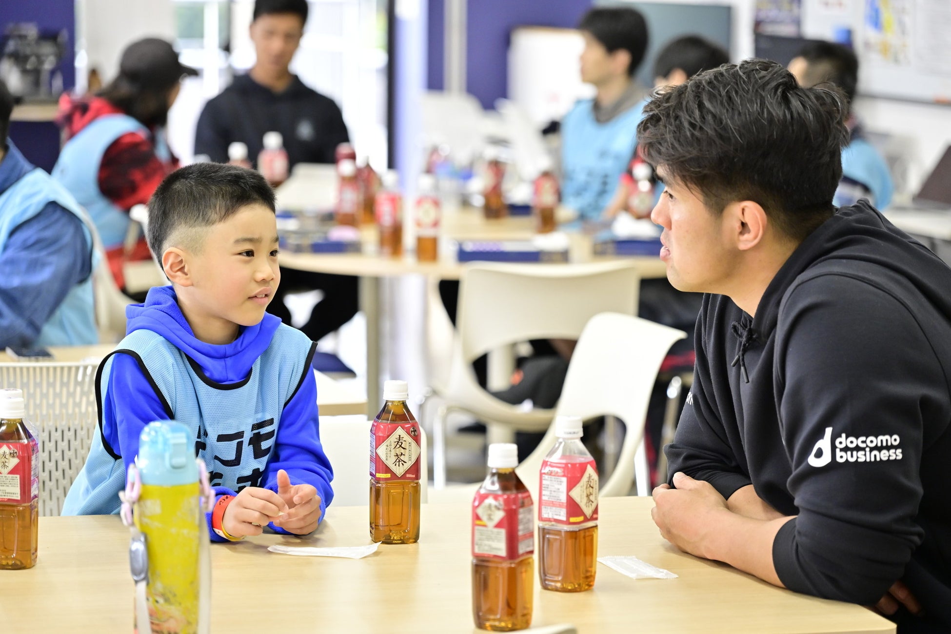 続いて選手との食事会。食事は普段選手が食べているものと同様の食事を召し上がってもらいました。選手とすっかり仲良くなった子どもたちからは、「休みの日は何してる?」「小学校の時はどのくらいご飯食べてた?」など、たくさんの質問が飛び出し、選手たちが答える場面も。お腹いっぱいに