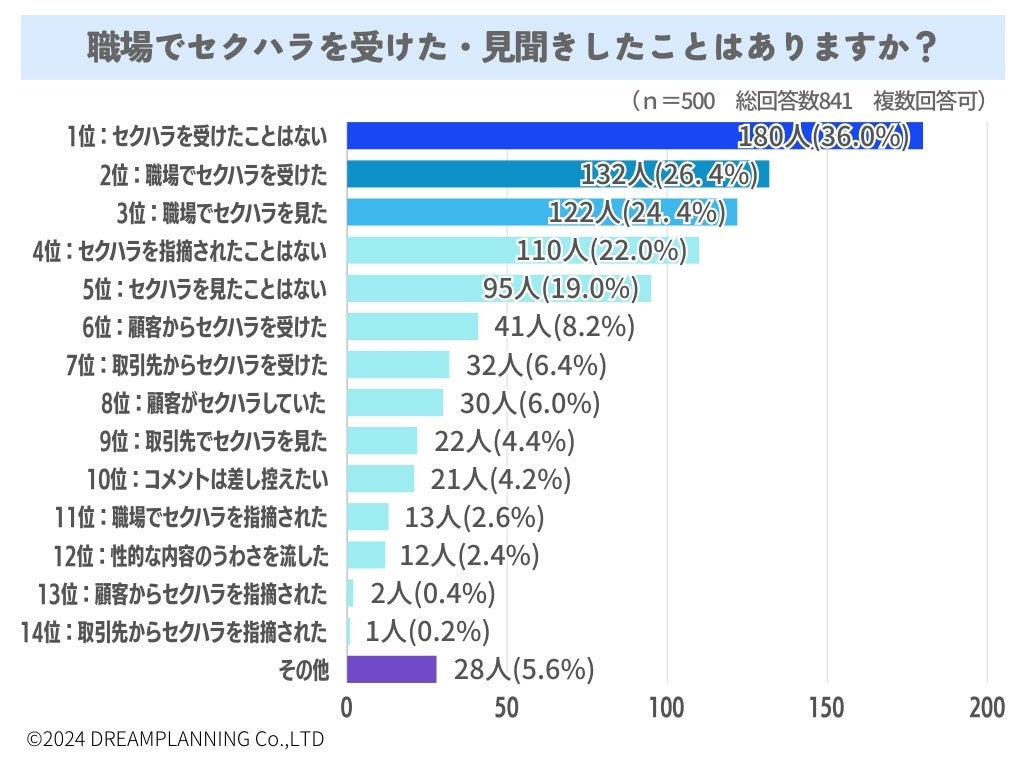 ★ 1位:セクハラを受けたことはない 180/500名(36.0%) ★