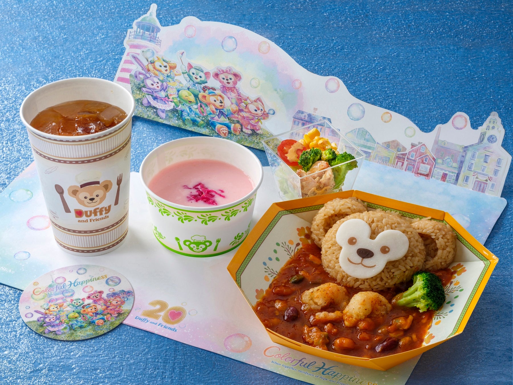 20 周年のテーマは、“ダッフィー&フレンズだからこそ見つけられる幸せ”。日常の小さな幸せに気付くことができるダッフィーたちが、ドーナツを半分に割ると虹になることを発見したり、ドーナツの穴を通してみんなの笑顔を見つけたり、ほっこりと優しい気持ちになることができるようなデザインです。また、同日より東京ディズニーシー・ホテルミラコスタ(R)で「ダッフィー&フレンズのフィルド・ウィズ・ジョイ!」のメニューを販売するほか、ディズニーリゾートラインでも特別なデザインのフリーきっぷを販売するなど、ダッフィー登場20周年をさらに盛り上げます。
