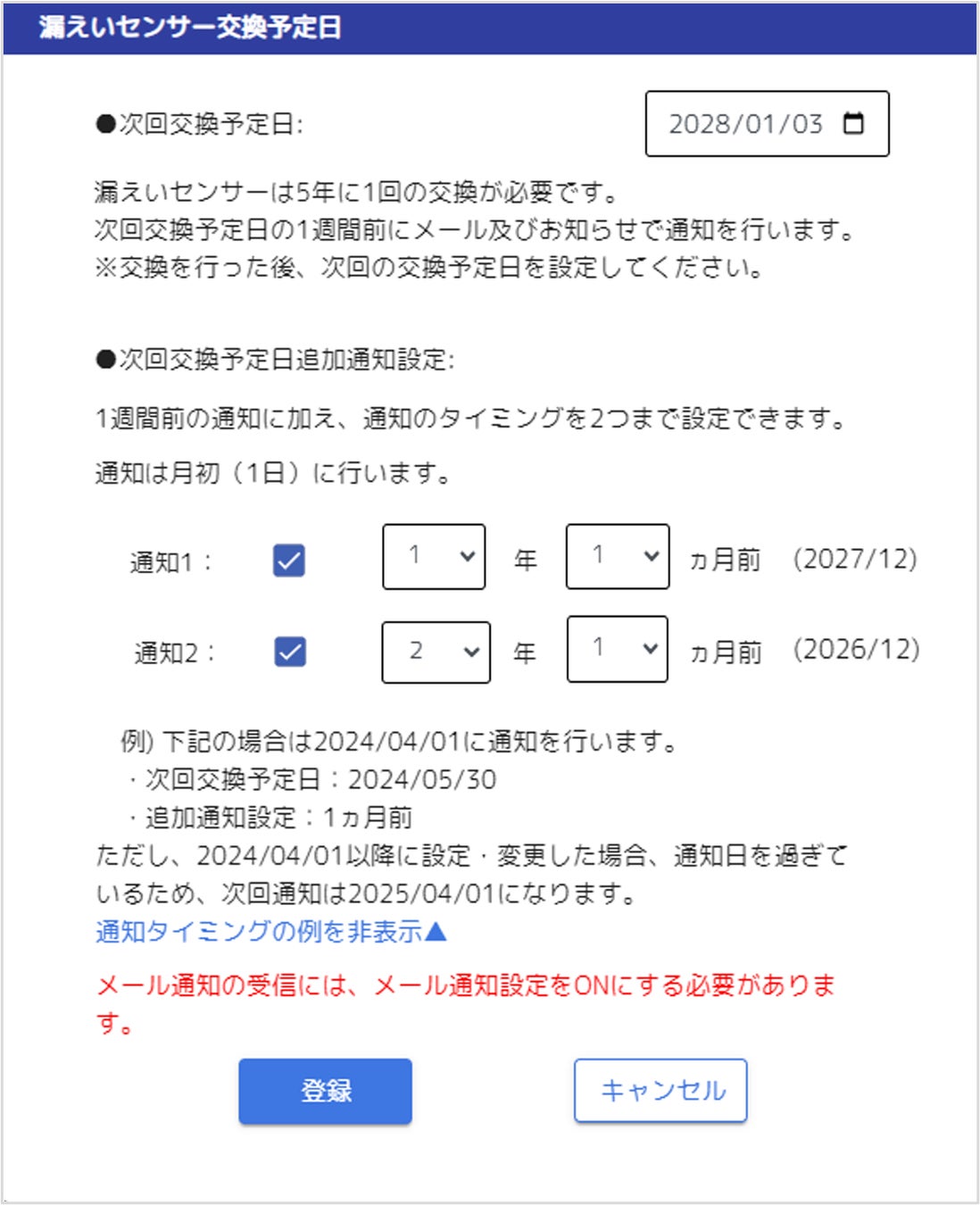 交換予定日から任意で2回、最長59カ月前までの通知タイミングが設定でき、メールとアプリを介して通知することで、保守・管理計画をサポート