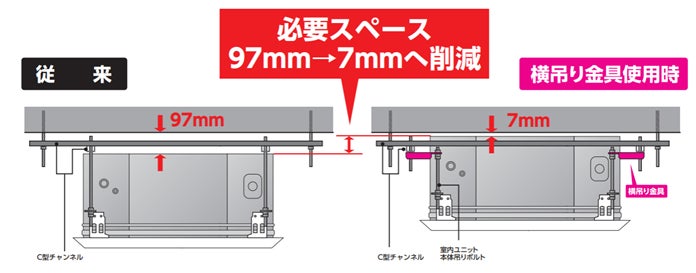 「横吊り金具」(別売)により、C型チャンネル(※10)などの鋼材を用いて室内ユニット「4方向天井カセット形<i-スクエアタイプ>」を吊る場合の天井裏の必要スペースを従来の97mm(※11)から7mmに削減でき、室内ユニット入替時の設置自由度が向上し、施工性を改善(※12)