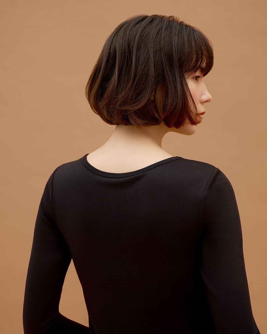 デザインも8分袖でトップスから見えづらく、窮屈すぎないややタイトめのすっきりシルエットで重ね着しても着膨れしないようにこだわりました。