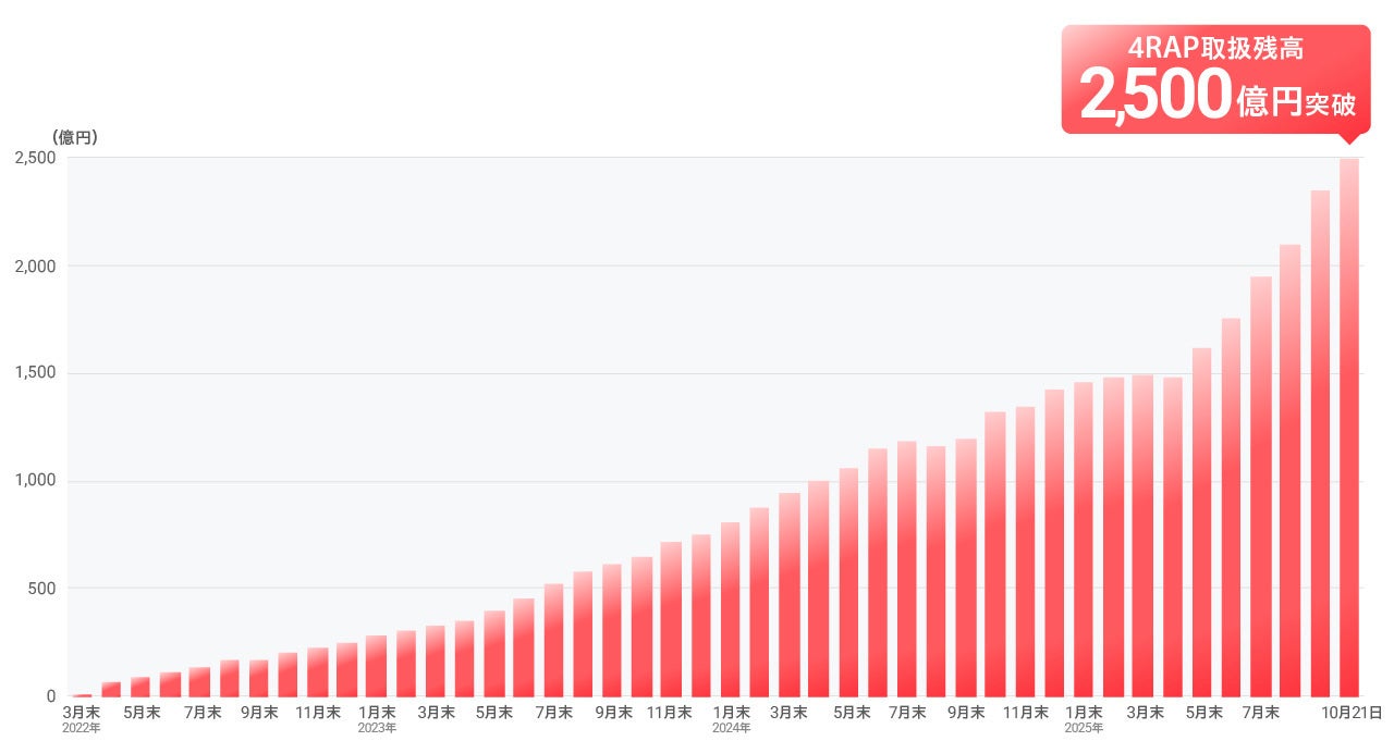 FOLIOでは、「4RAP」を導入する金融機関やそのお客さまの多様なニーズに対応したサービスを提供し続け、本年8月14日の取扱残高2,000億円達成から、わずか約2か月で2,500億円を突破しました。