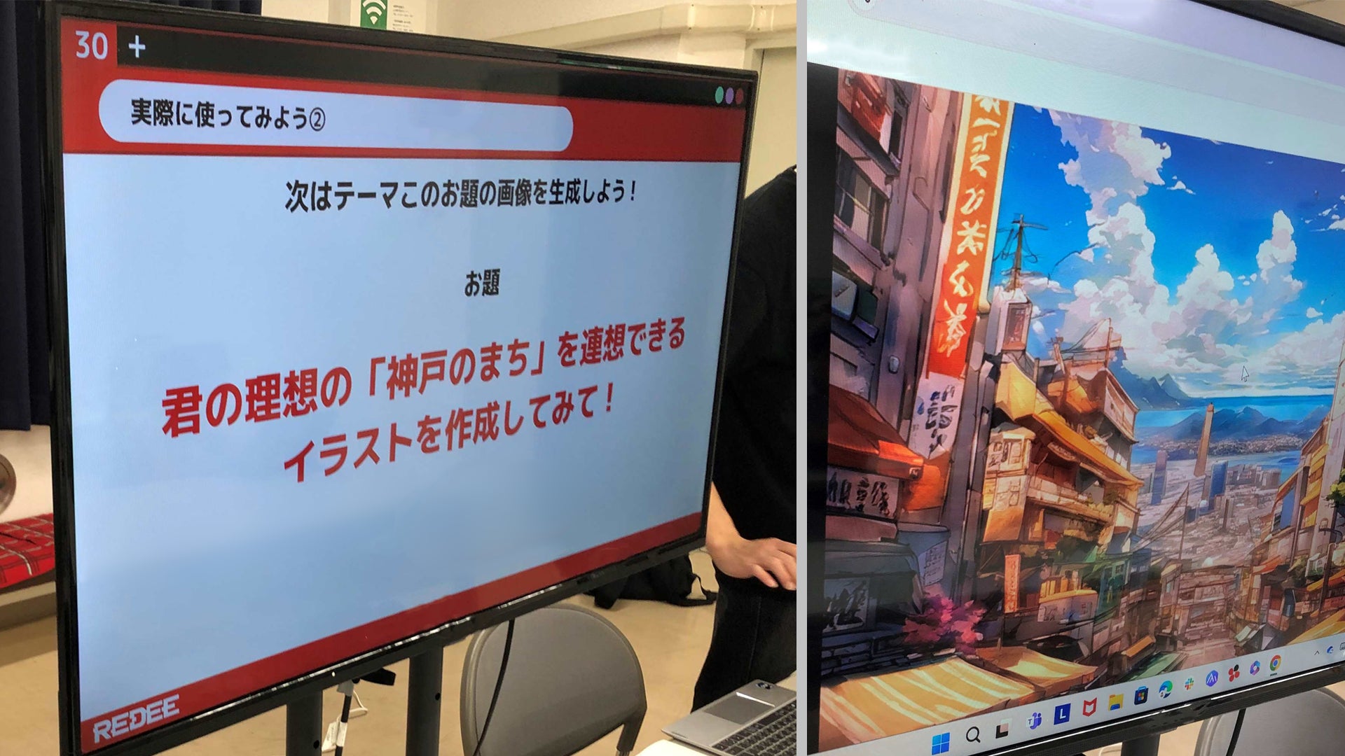 参加者は思い思いのキーワードを用いて、理想の「神戸のまち」のイラストを作成し、出来上がったイラストと生成AIに使用したキーワードなどについて発表してもらいました。