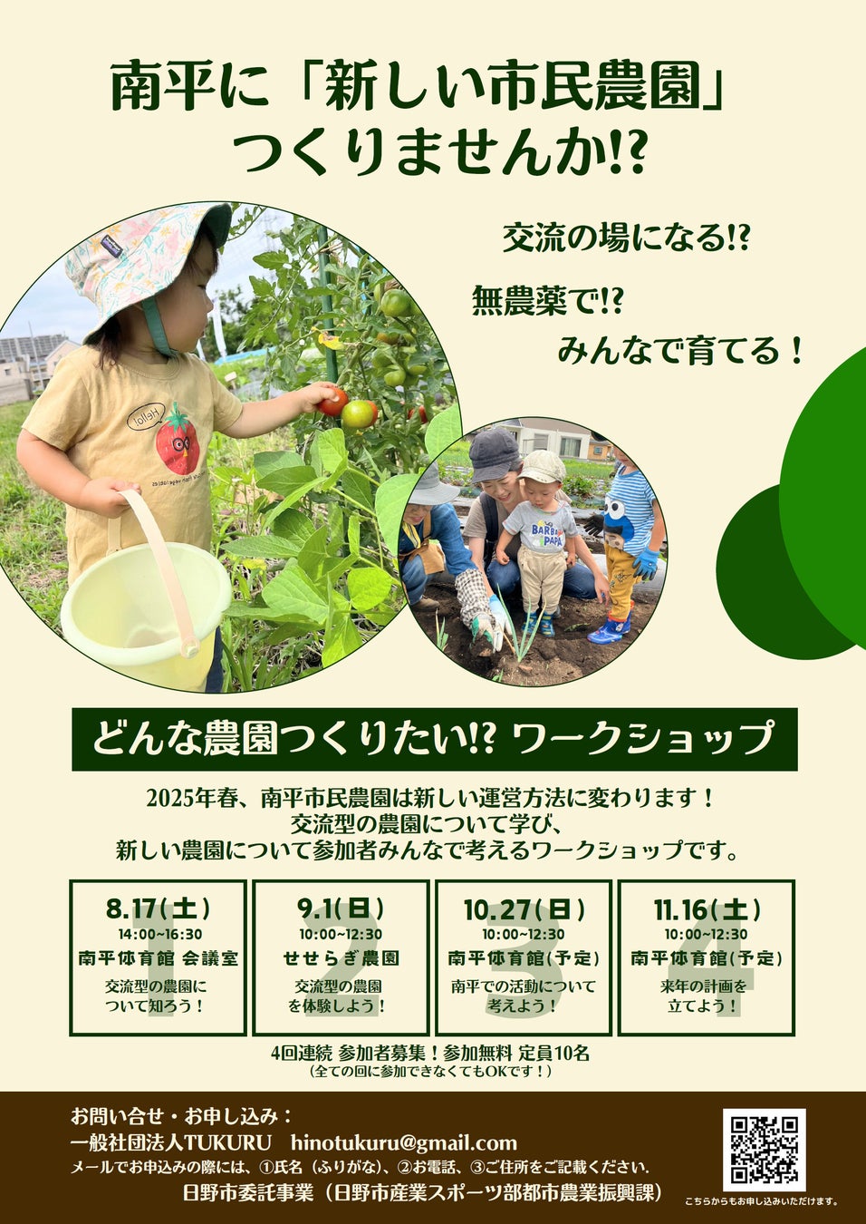 8月17日(土)、9月1日(日)、10月27日(日)、11月16日(土)に新しい農園について参加者みんなで考えるワークショップを行います。