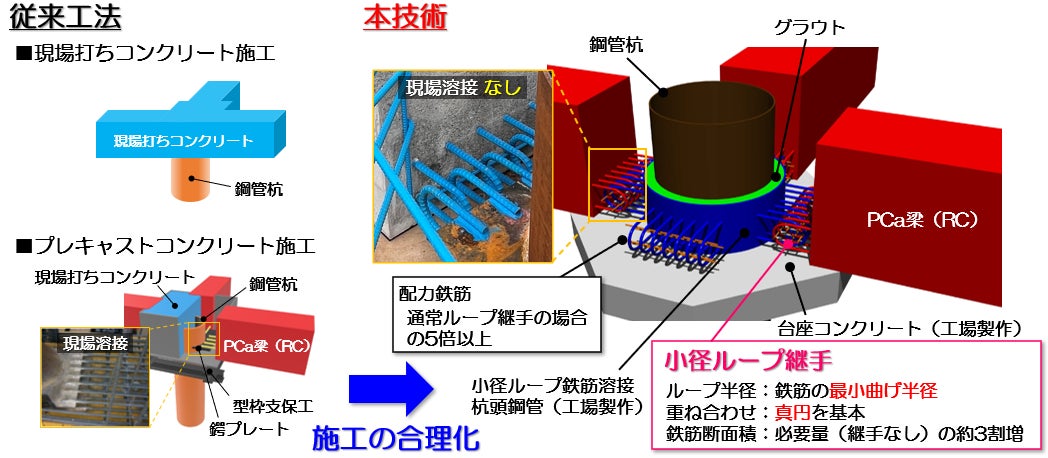 TM-LOOP工法(本工法)は、鋼管杭と鉄筋コンクリート(RC)製プレキャスト(PCa)梁の接合にループ継手を採用しています。ループ継手は、杭頭鋼管※2とPCa梁に設けられたループ鉄筋と、それらを重ね合わせたループ内部に配置する配力鉄筋で構成されます。互いのループ鉄筋を所定の形状で重ね合わせて接合するため、海上での溶接作業を省略することができます。また、ループ鉄筋の折曲げを最小半径※3とすることで、鋼管杭とPCa梁の間隔を狭め、現場打ちコンクリートの数量を減らすことができます。