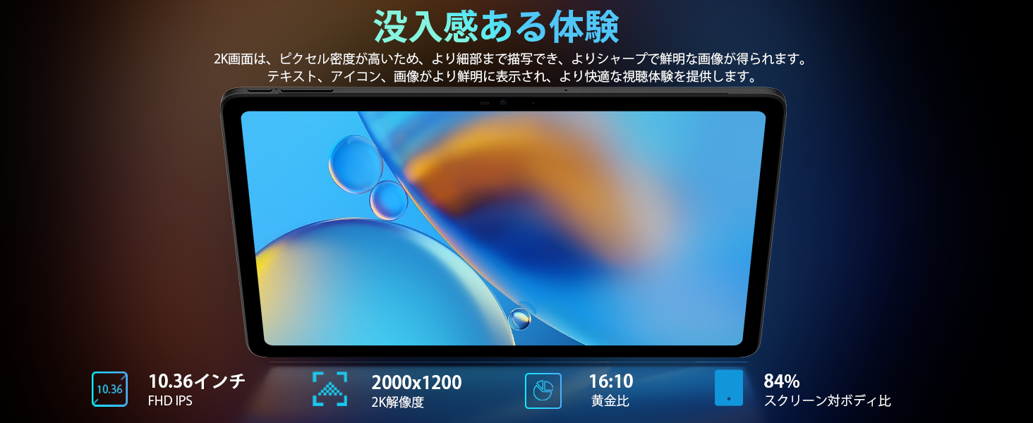 15GB RAM(8GB+7GB拡張)+128GB ROM+1TB拡張可能、UnisocT616 8コアCPU、10.4インチ FHD IPS 2Kディスプレイ+WideVine L1対応+4G LTEモデル, 13MP/5MPカメラ+7500mAh+児童守護+無線投影+画面分割