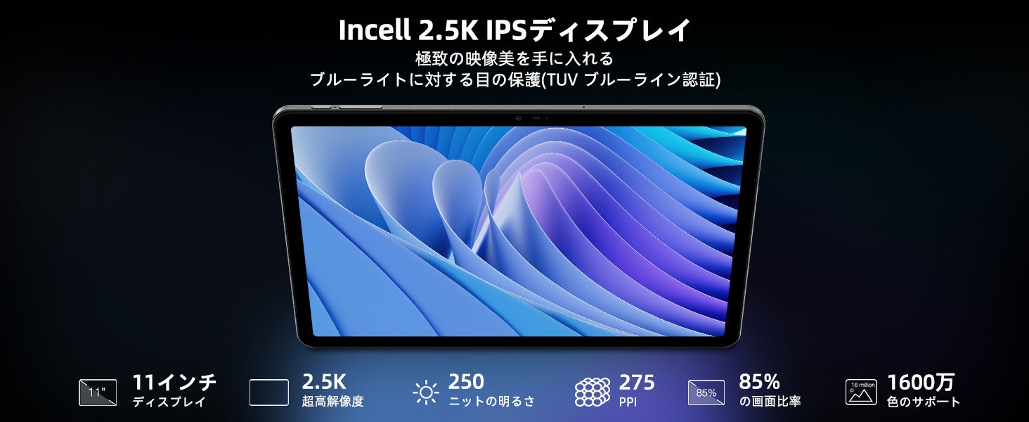 DOOGEE T30 Pro 11インチ タブレットの高精細IPSスクリーンを、2.5K 解像度は1600x2560。ブルーライト比率の認証である,TÜV認証を取得しており、目に優しい画面で長時間使用しても疲れにくく安心です。さらにDCI-P3カラーレンジにも対応し、鮮やかで豊かな色彩を提供し、あらゆる体験に最適な没入感を提供します。