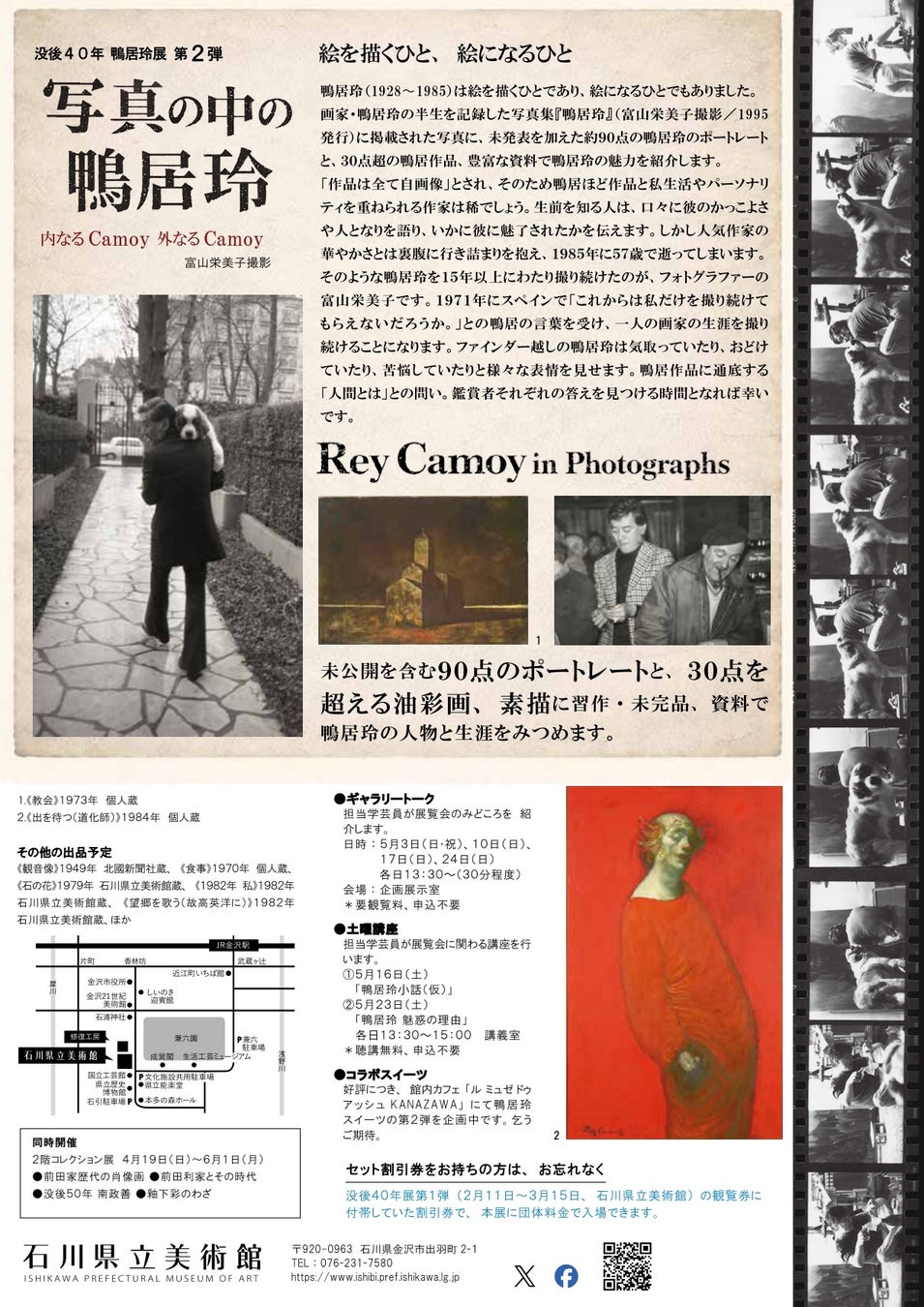 石川県立美術館(金沢市)は、2026年4月25日(土)から5月24日(日)まで、没後40年記念展の第2弾として「写真の中の鴨居玲 -内なるCamoy 外なるCamoy-」を開催します。本展は、生涯をかけて「人間とは何か」を問い続けた画家・鴨居玲(1928-1985)の素顔に迫る特別展です。フォトグラファー富山栄美子が15年以上にわたり撮り続けたポートレートの中から約90点(未発表を含む)と、鴨居の代表的な油彩画・素描など約40点を一堂に展示。「作品はすべて自画像」と語った画家の内面と、ファインダー越しに捉えた生身の表情から、「内なるCamoy 外なるCamoy」をご覧いただきます。