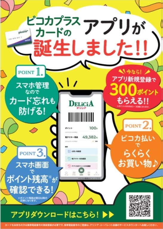スーパーのデリシアでは、お客様にご利用いただいている、ポイント&プリペイドカード『ピコカプラスカード』をより便利にご利用いただけるモバイル版サービスを開始いたします。