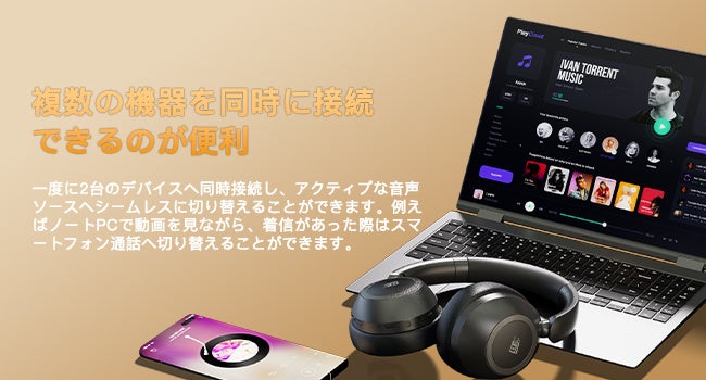 2台のデバイスに同時接続が可能で、仕事用とプライベート用を簡単に使い分けることができます。WEB会議中の電話対応など、多くのシーンで便利に活用できます。