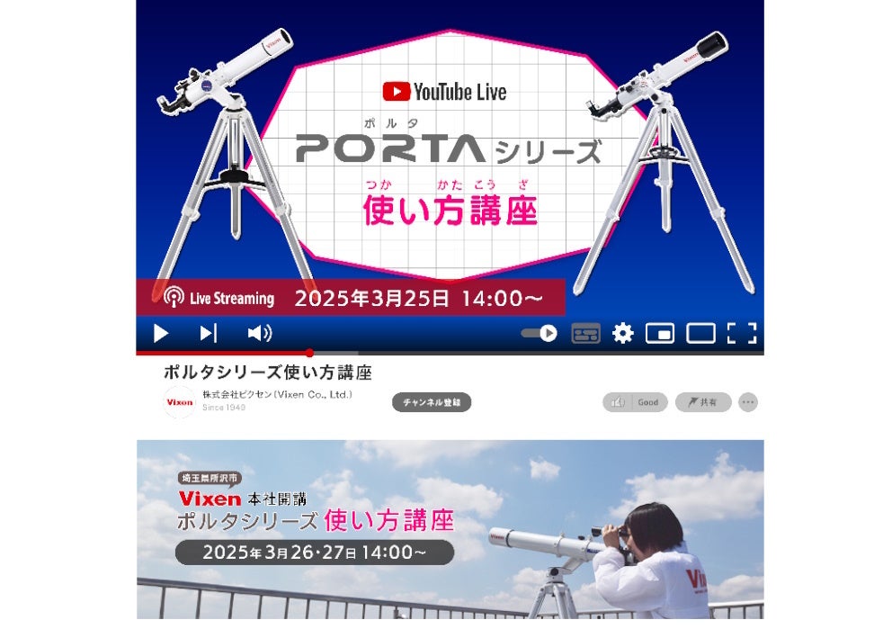 この講座は、ポルタシリーズ(※)をお持ちの方限定です。3月25日(火)のオンライン講座、3月26日(水)、3月27日(木)のビクセン本社での実地講座を開講いたします。