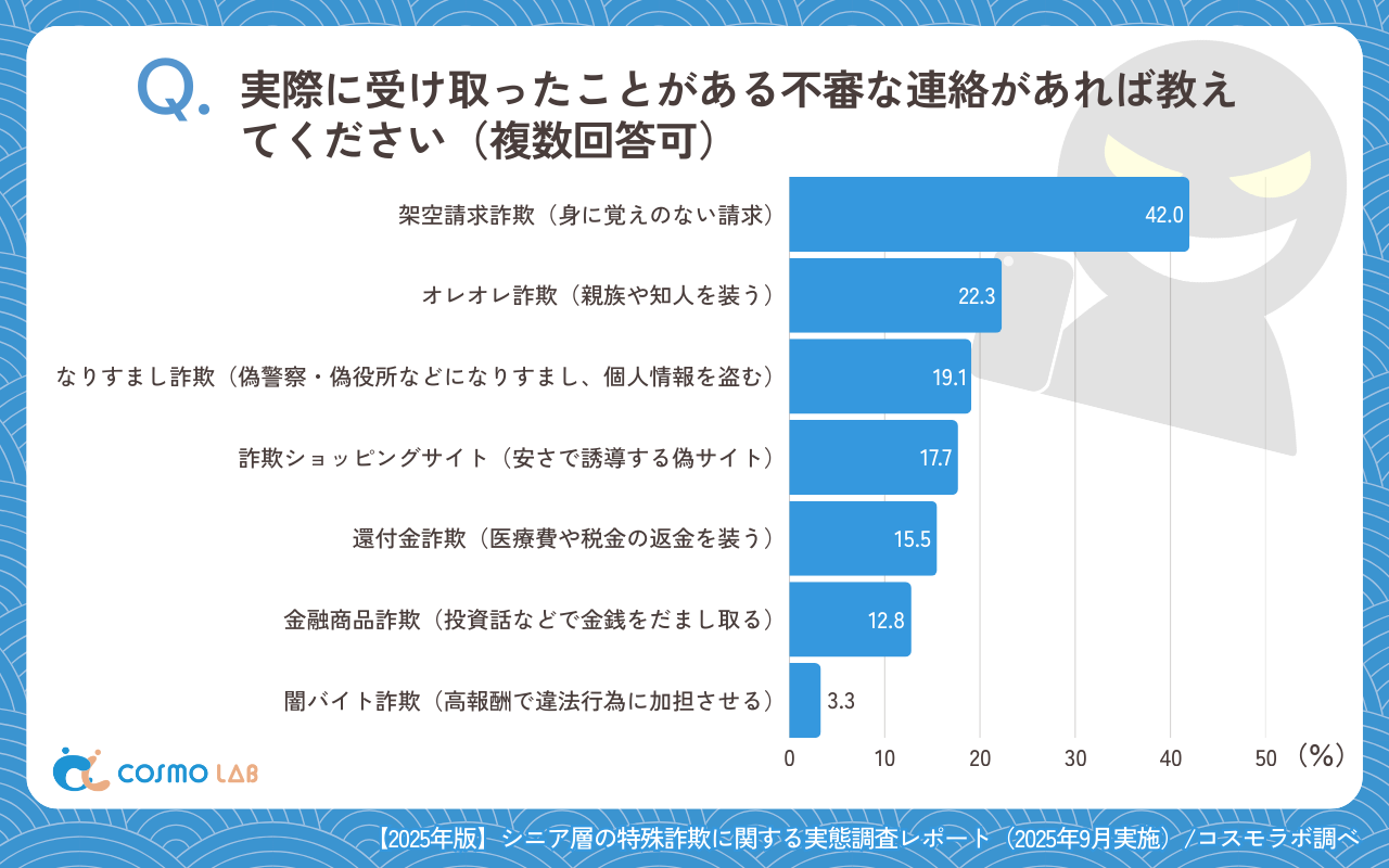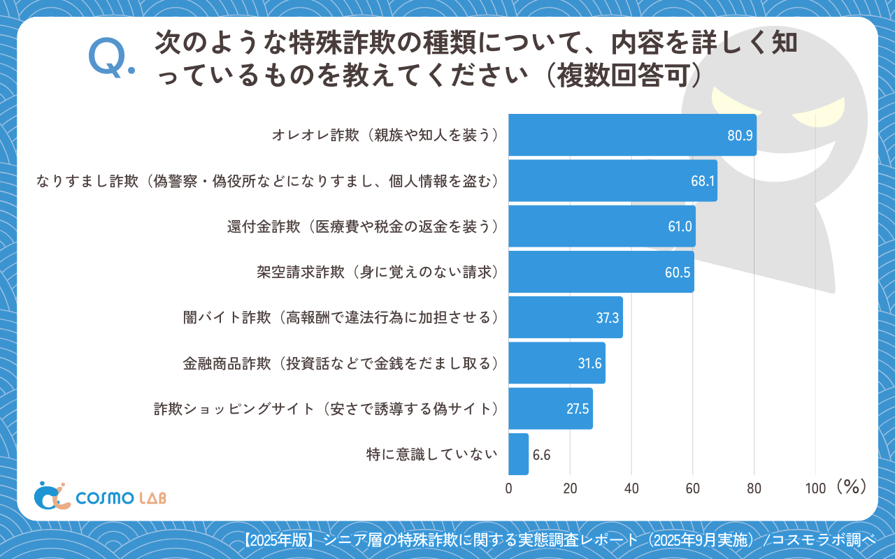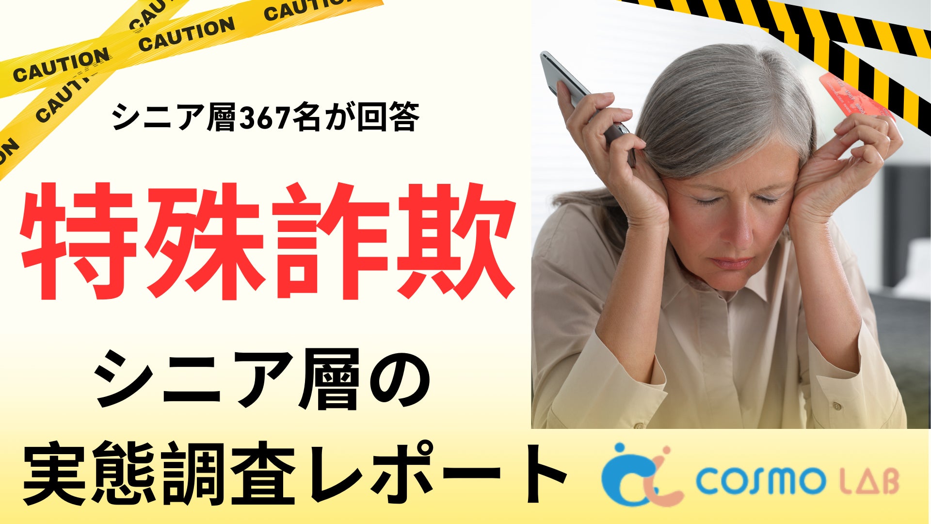 シニア専門のマーケティングプラットホーム コスモラボ(会社名:コスモヘルス株式会社、本社:東京都港区、代表取締役社長 小塚 崇史)がシニア層の『特殊詐欺』に関するアンケートリサーチのレポートをリリースしました。本調査では、50歳以上のシニア層を対象に、特殊詐欺の「認知」「不安」「被害・未遂経験」「現在の対策」「今後求めるサービス」について実態を把握しました。日常生活に潜むリスクと、家族・社会に求められる対策の方向性が明らかになりました。