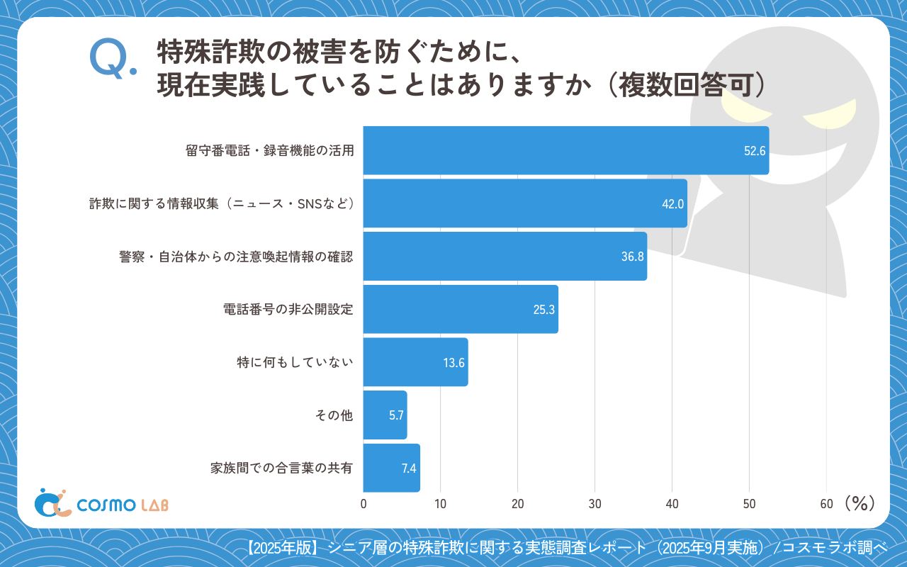 現在の対策としては、「留守番電話・録音機能の活用」(52.6%)が最多で、「詐欺に関する情報収集(ニュース・SNSなど)」(42.0%)、「警察・自治体からの注意喚起情報の確認」(36.8%)が続いている。