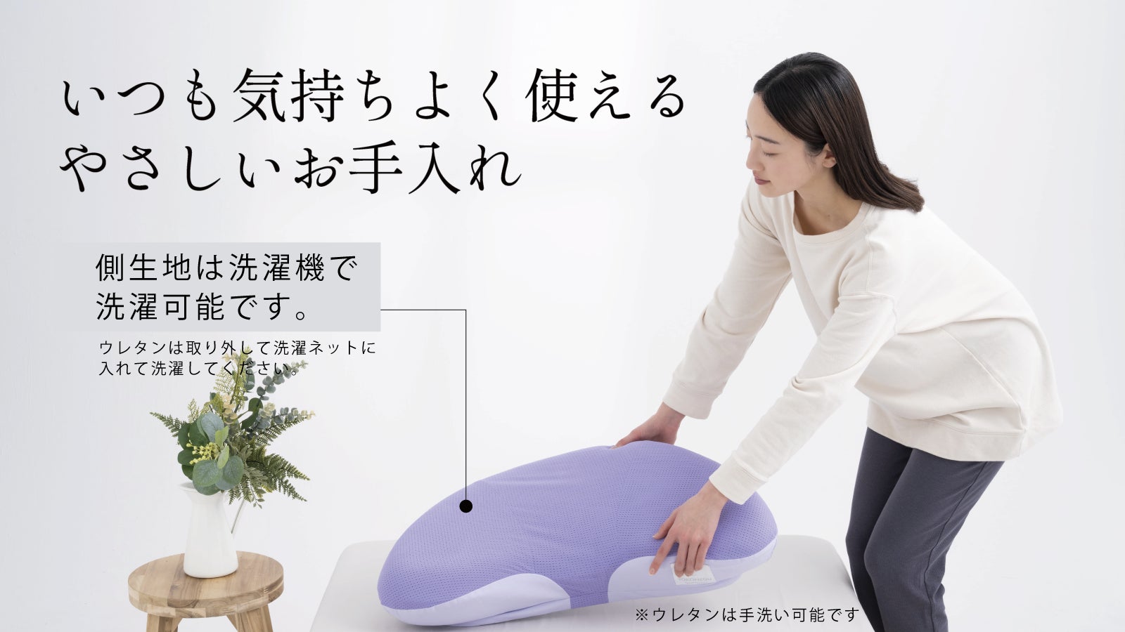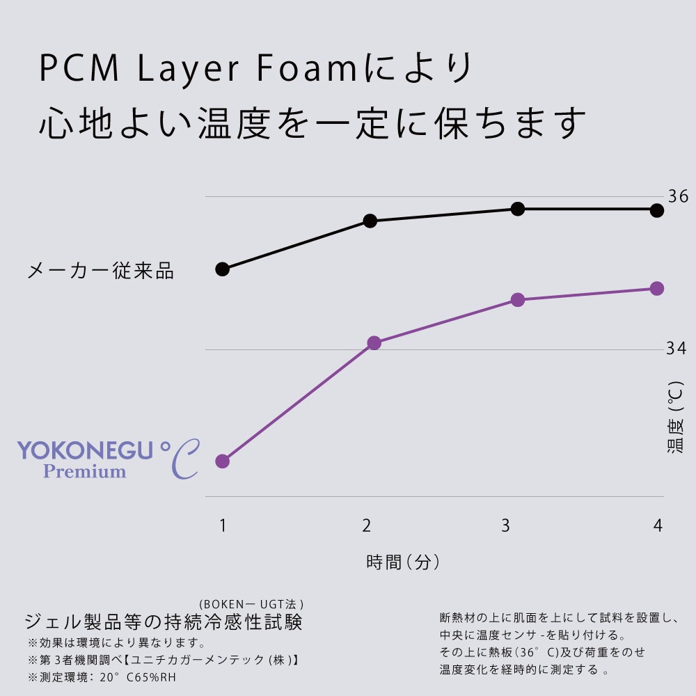 本製品では、温度変化を穏やかに整えるPCM(相変化素材)を配合したウレタンフォームを採用。温度が上がりすぎると熱を吸収し、下がるとゆるやかに放出する性質を活用し、入眠時の温度変化を妨げない環境づくりを目指しました。