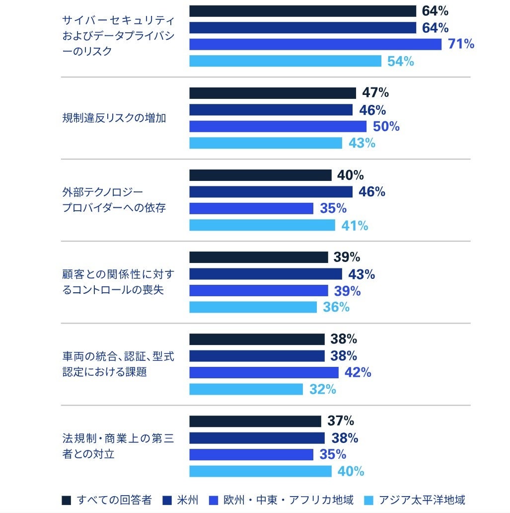 SDVにより自動車業界の構造が変わり始め、新たな機会とリスクが生じています。ほぼすべてのSDV関連機能において、これからOEMとテック企業のどちらが主導していくか、グローバルエグゼクティブの意見は割れています(図4)。また、SDVのサプライヤー・パートナーとの連携が拡大するなか、「サイバーセキュリティおよびデータプライバシーのリスク」などへの懸念も強まっています(図5)。自動車企業はこれらの機会やリスクに対応するため、自社保有、共同開発、外部委託するテクノロジーを戦略的にすみ分け、管理することが求められています。