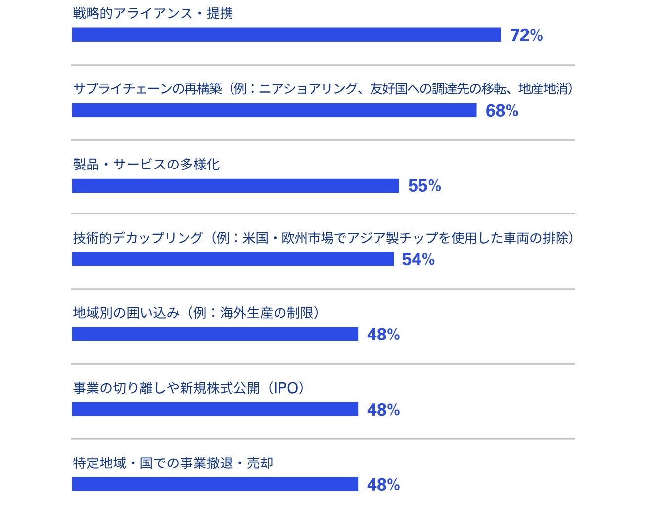 図2:貿易摩擦の激化や脱グローバル化への対応として、次の戦略的施策を実施する可能性はどの程度あるか(「すでに実行中」「現在導入中」と回答した割合)