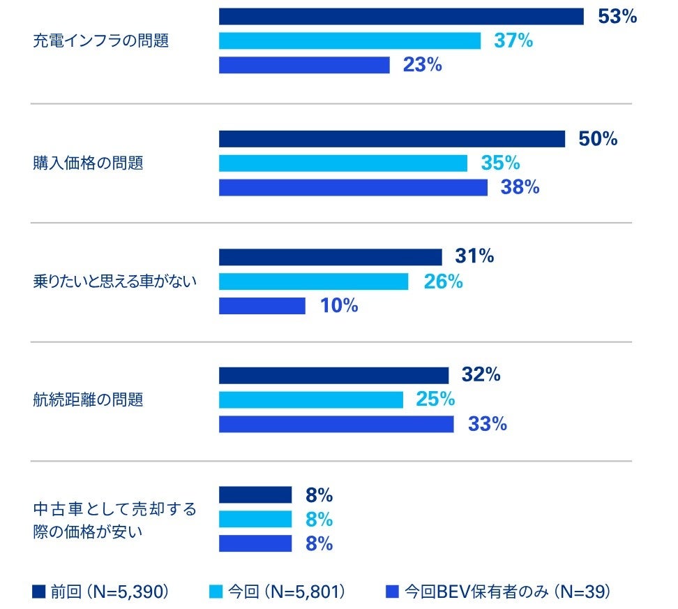 日本の消費者に、今後5年以内に車を購入するとしたらどの動力タイプを検討するかを質問したところ、第1位がエンジン車で77%、第2位がHEVで30%という結果になりました。前回調査(2023年11月)と比較して、エンジン車の購入検討意向が増加している代わりに、PHEV、BEV、FCEV・水素エンジン車は大幅に減少しました(図6)。一方で、BEV普及の障害として考えられている「充電インフラ」「購入価格」「航続距離」などの懸念は縮小しています(図7)。BEVの購入のハードルは下がっているものの、消費者の購入意欲が減退している今、BEV普及は新たな局面を迎えています。