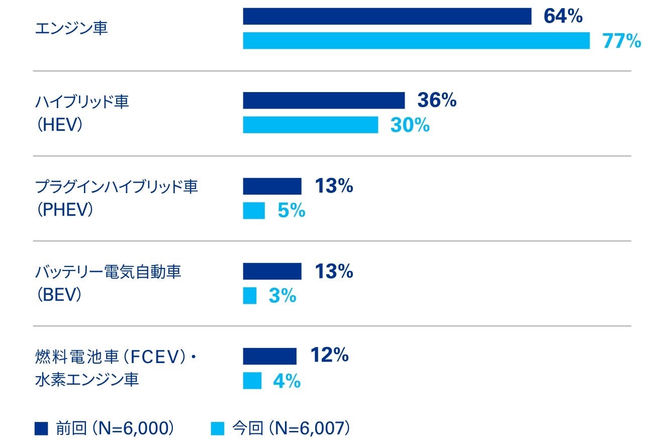 • 日本の消費者は次回車を購入する際、エンジン車77%、HEV30%の順で検討すると回答。前回調査と比較して、エンジン車の購入検討意向が増加し、PHEVやBEVは大幅に減少した