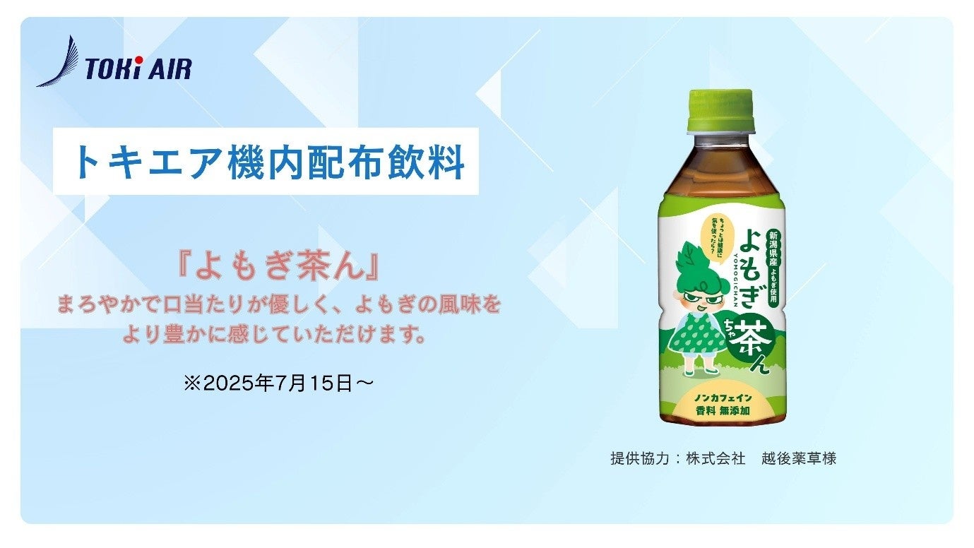 新潟拠点の地域航空会社トキエア株式会社(本社:新潟県新潟市 代表取締役:長谷川政樹、和田直希 以下:トキエア)は2025年7月15日からの機内配布飲料についてお知らせします。今回ご提供するお飲み物は、株式会社越後薬草が手がける「よもぎ茶ん」です。