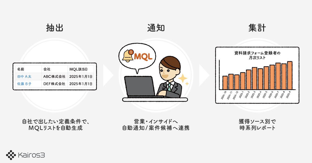 「Kairos3」導入企業が自社の条件や基準にもとづいてMQLを設定でき、その定義に沿って自動的に顧客情報を抽出・集計できるようになりました。企業ごとの判断基準に合った成果を可視化できるようになり、営業やマーケティング活動の分析精度がさらに高まります。